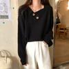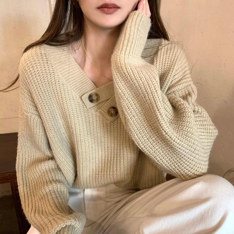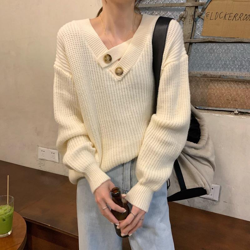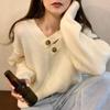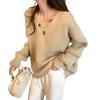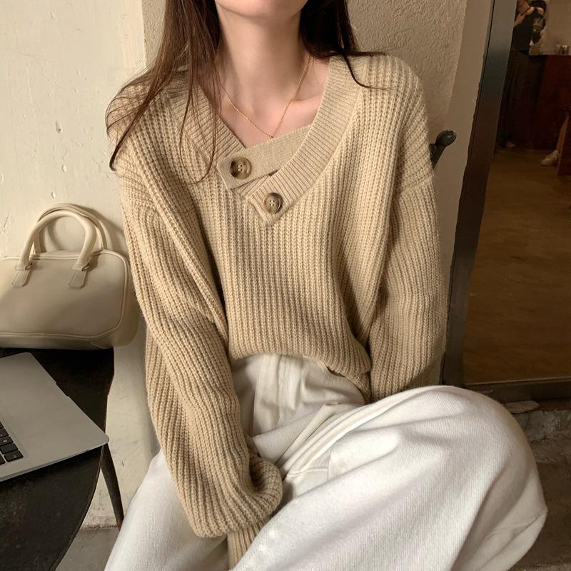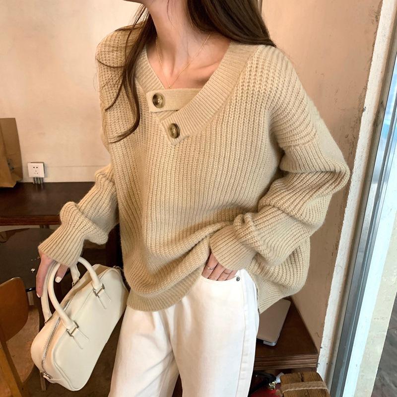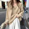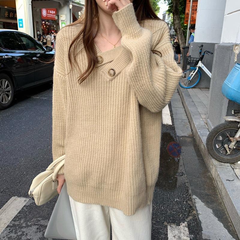Suéter feminino de decote V suéter feminino outono e inverno solto desgaste externo estilo preguiçoso 2023 novo suéter de cor sólida pullover de comprimento médio