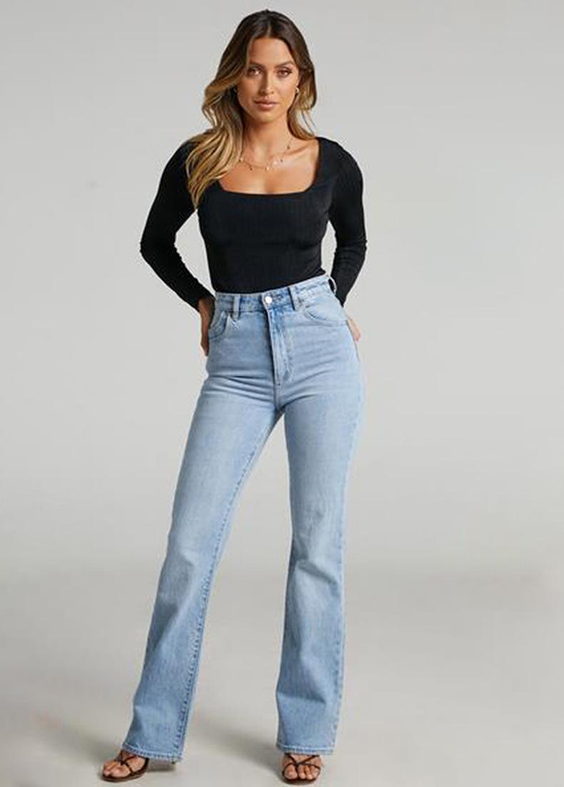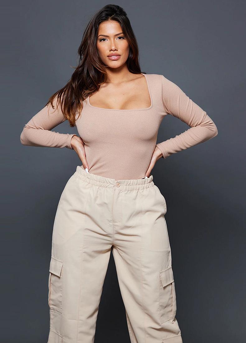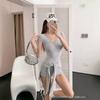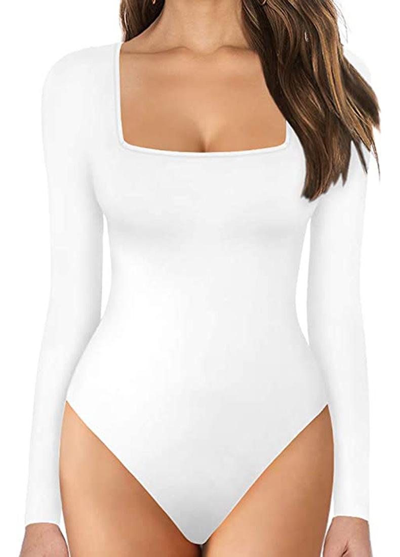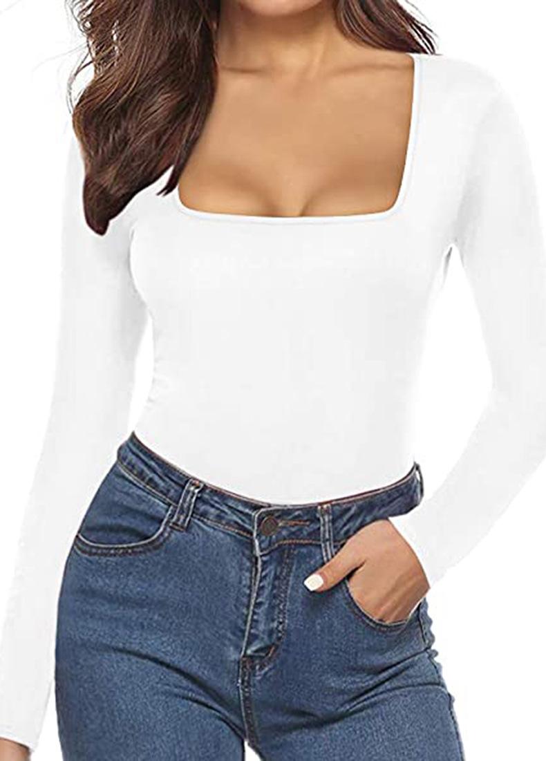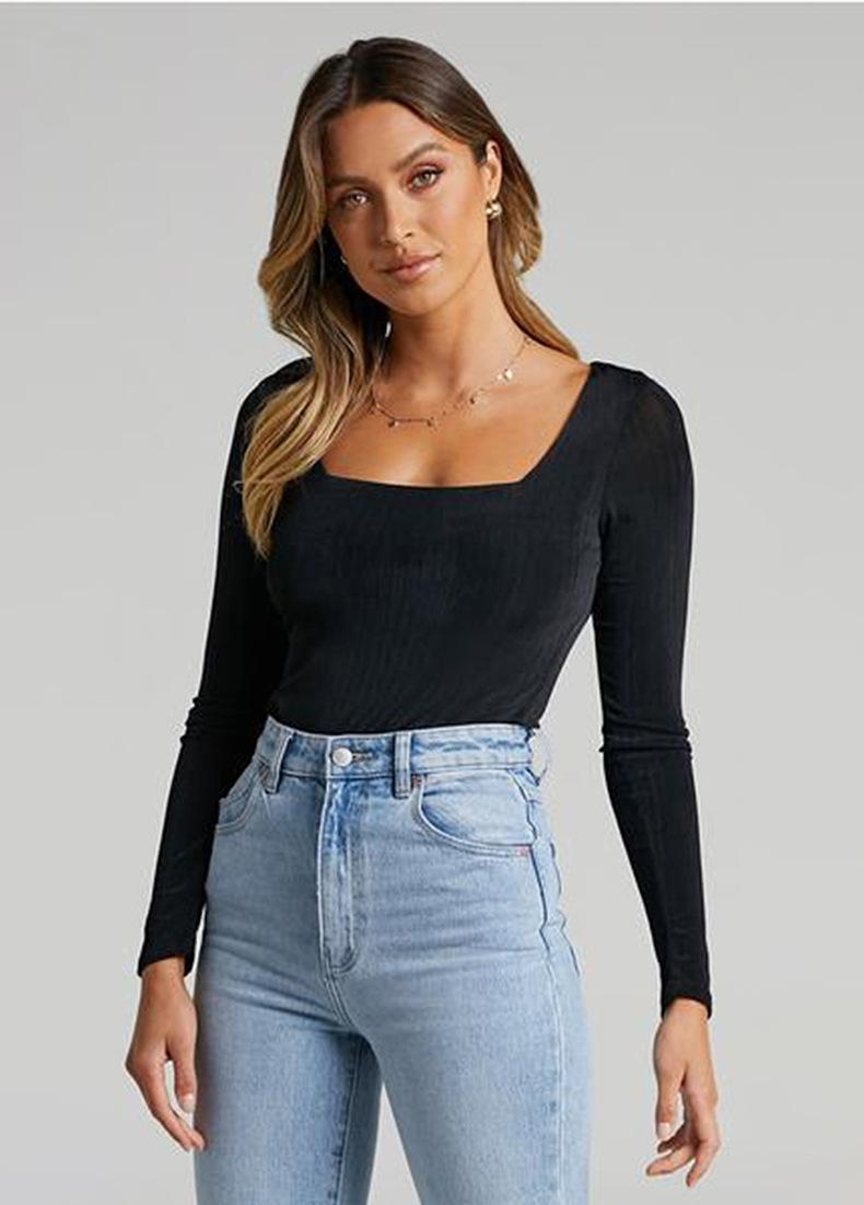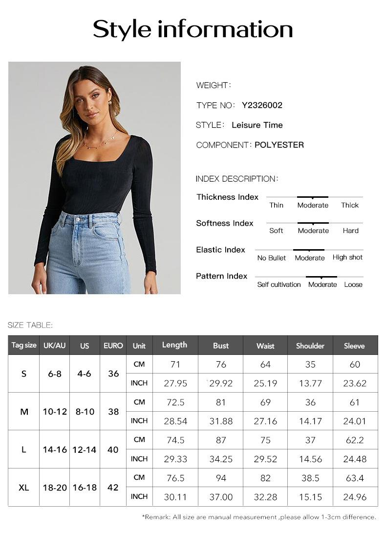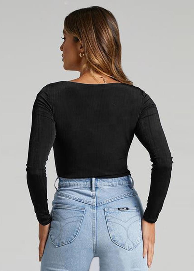 [Quatro pinos de seis linhas] Diyun Europeu e Americano transfronteiriço preto estilo esportivo macacão apertado das mulheres de manga comprida gola quadrada assentamento camisa