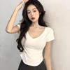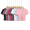 Estilo europeu e americano Sexy com decote em V plissado camiseta de manga curta feminina 2023 verão novo estilo spice girls cor sólida slim fit short top