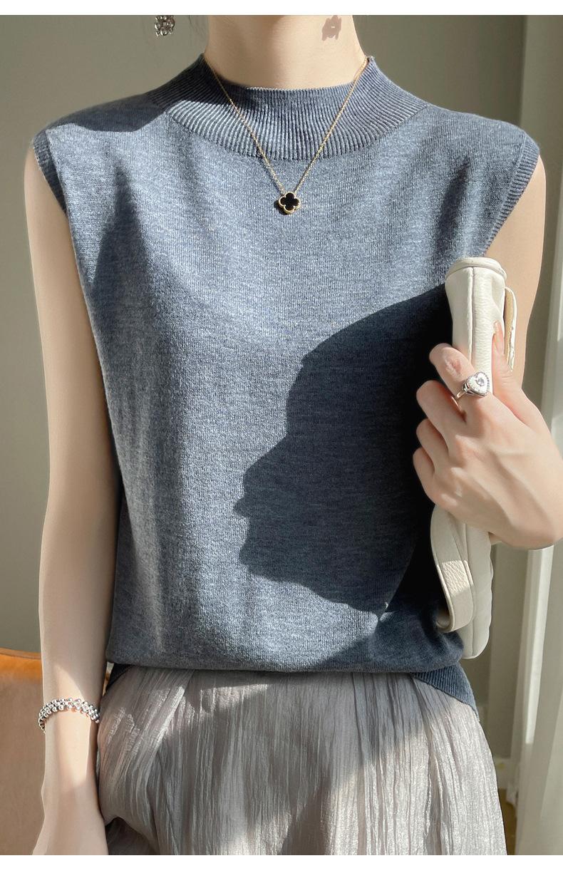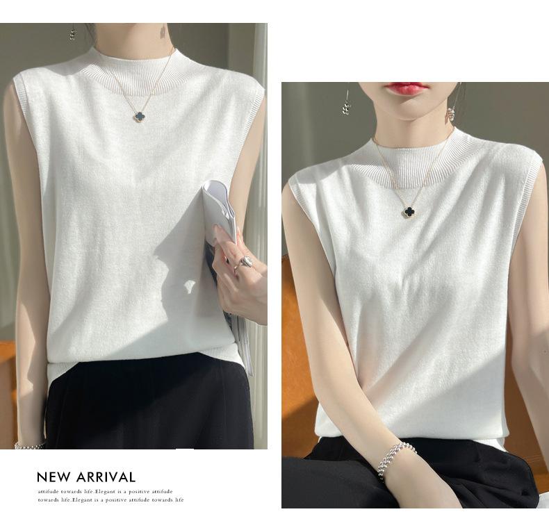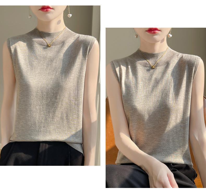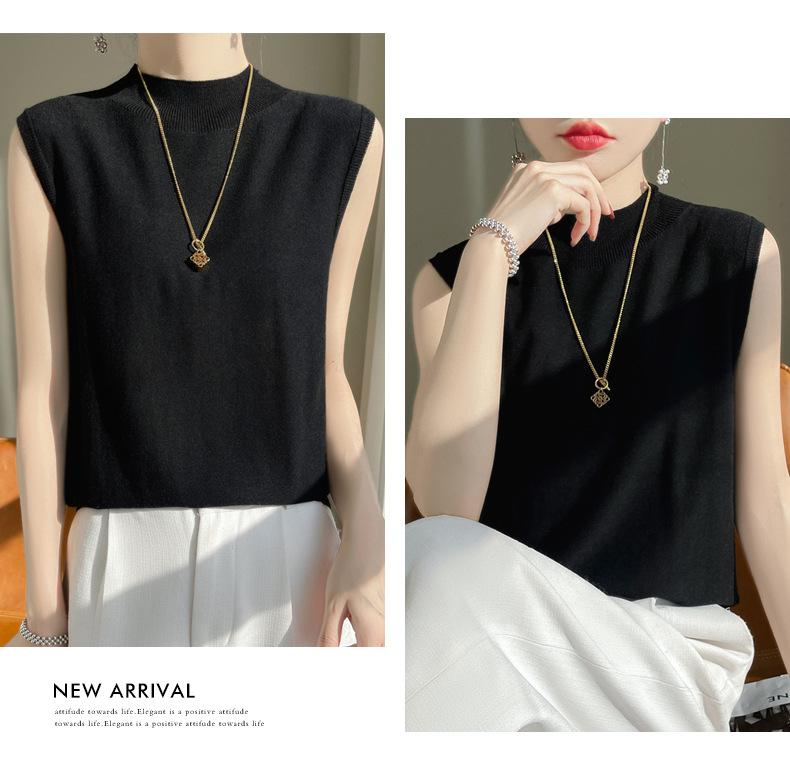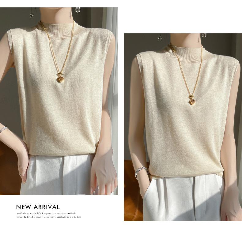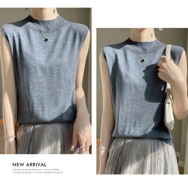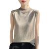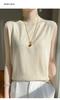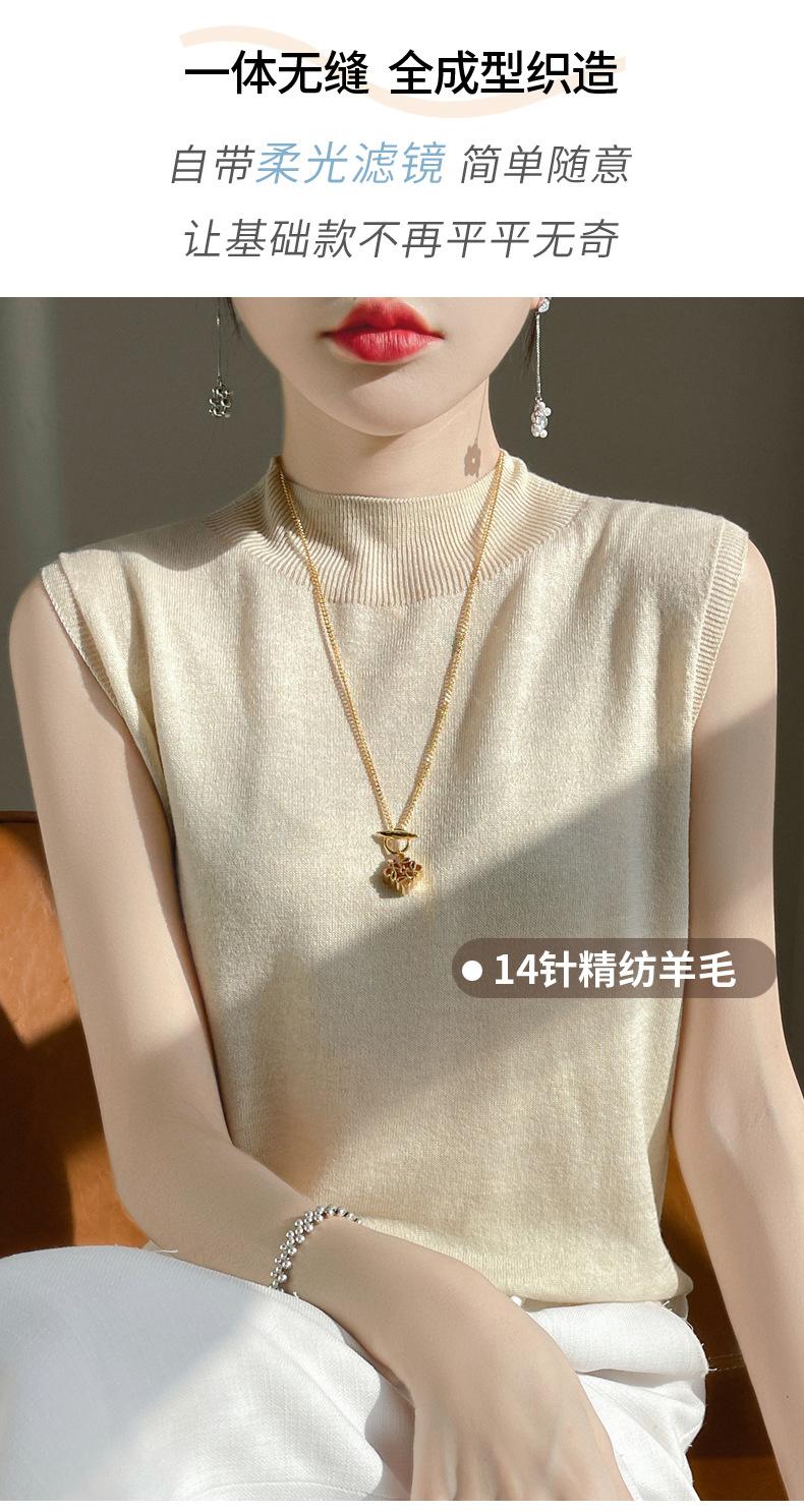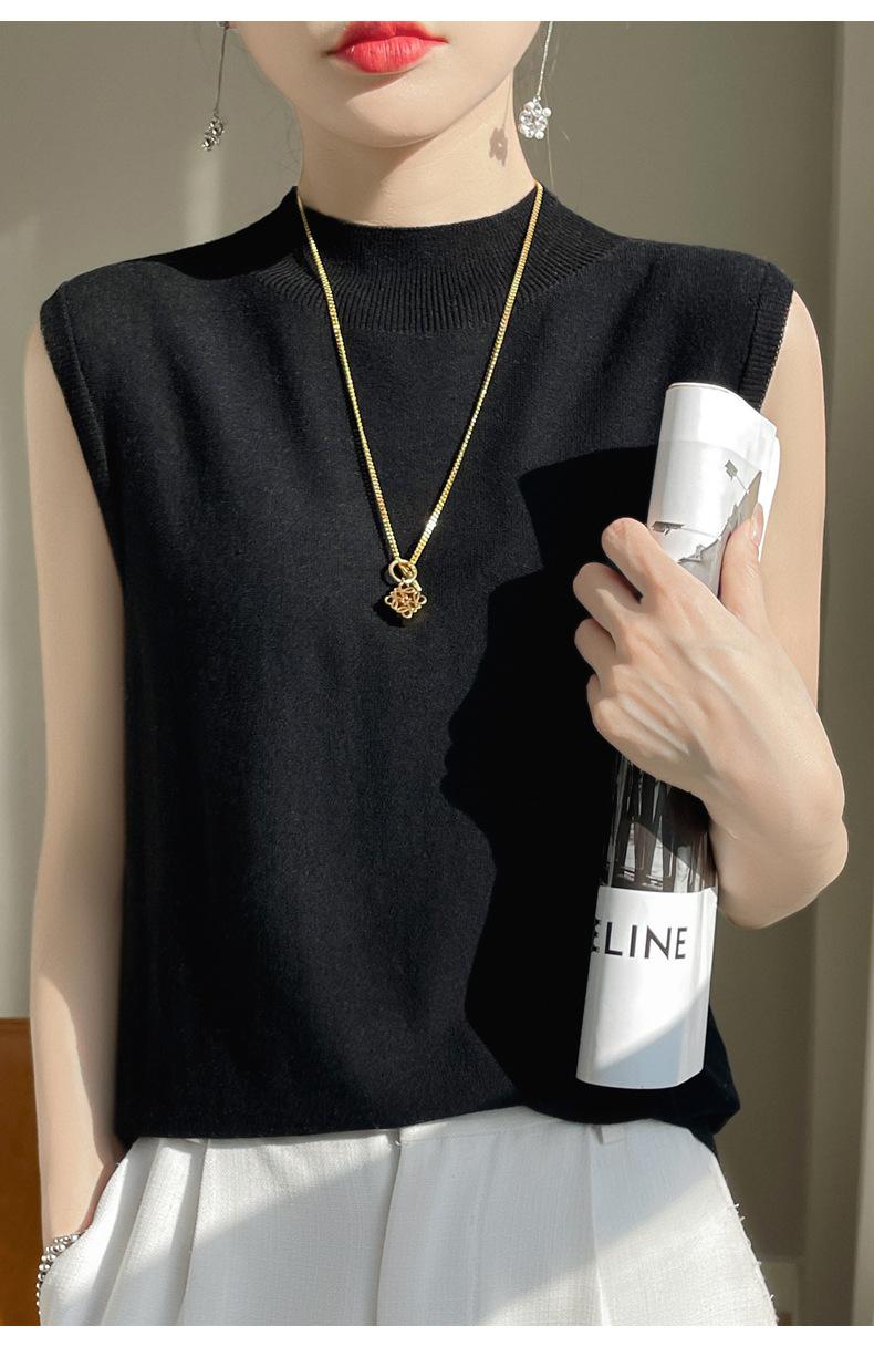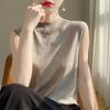 Camisa de base de colete de gola meia-alta retrô de primeira linha, suéter fino sem mangas de lã penteada feminina, camisa de malha