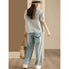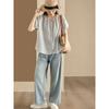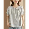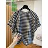 Camisa xadrez tingida de fio artístico feminina plissada de manga curta Pullover camisa xadrez elegante