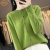 Cardigan de malha feminino, início da primavera de 2024, novo suéter de gola redonda 100% lã pura, casaco de manga comprida, blusa de malha externa