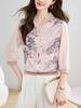 Nova Guofeng camisa pequena das mulheres rosa top V-neck estampado blusa de meia manga solta