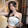 Camisola Regata Sem Costas com Alças Novo Estilo Verão Garota Quente Francês Retrô Camélia Gola Alça Fina Estilo Fragrante Regata