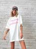 Verão 2025 Nova Camiseta Americana Retrô com Estampa de Texto Personalizada Tendência Casual Algodão Solta Top para Mulheres