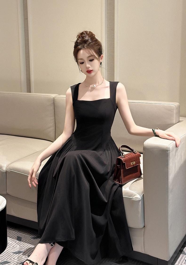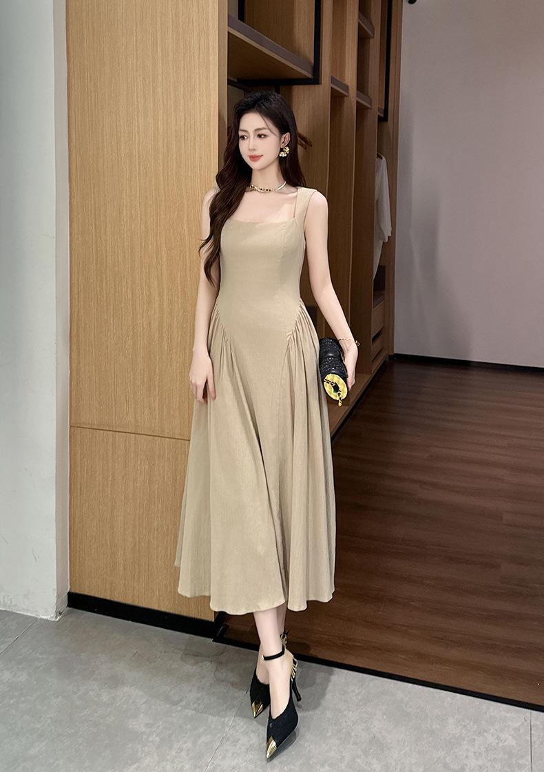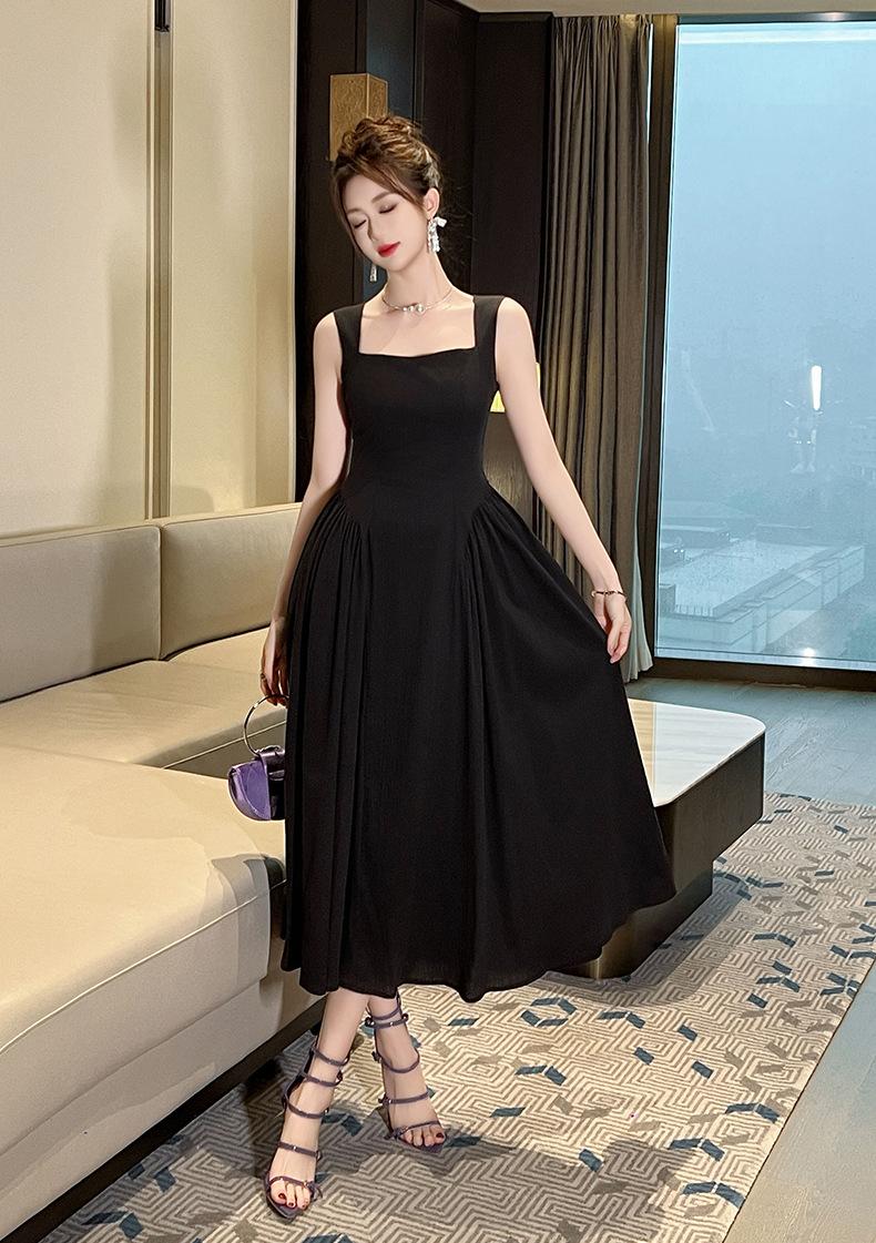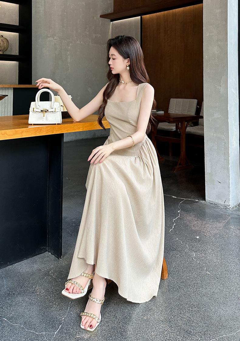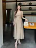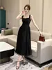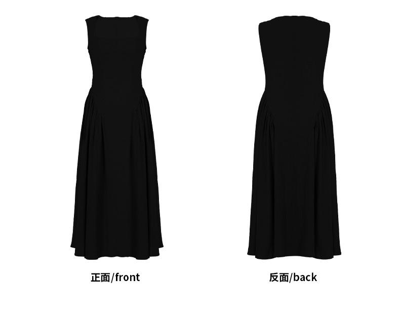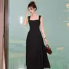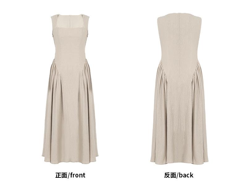 2025 Novo Vestido Longo Feminino de Verão Francês Decote Quadrado Cintura Plissada Cobrindo a Barriga Sem Mangas 9801