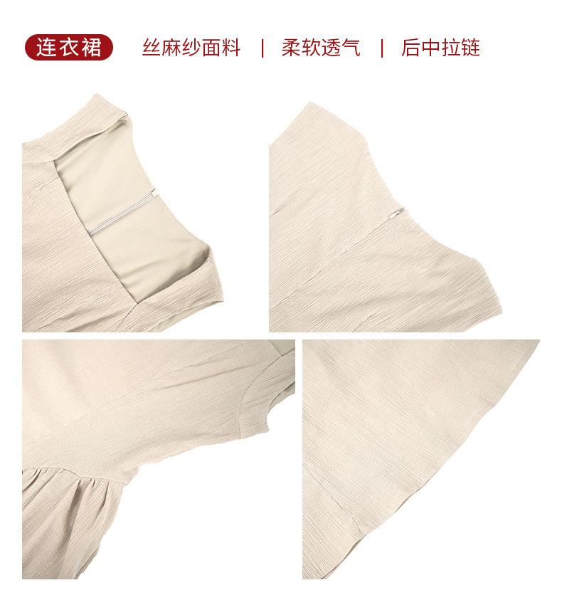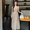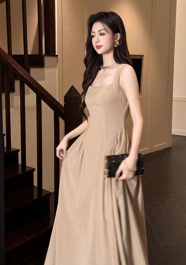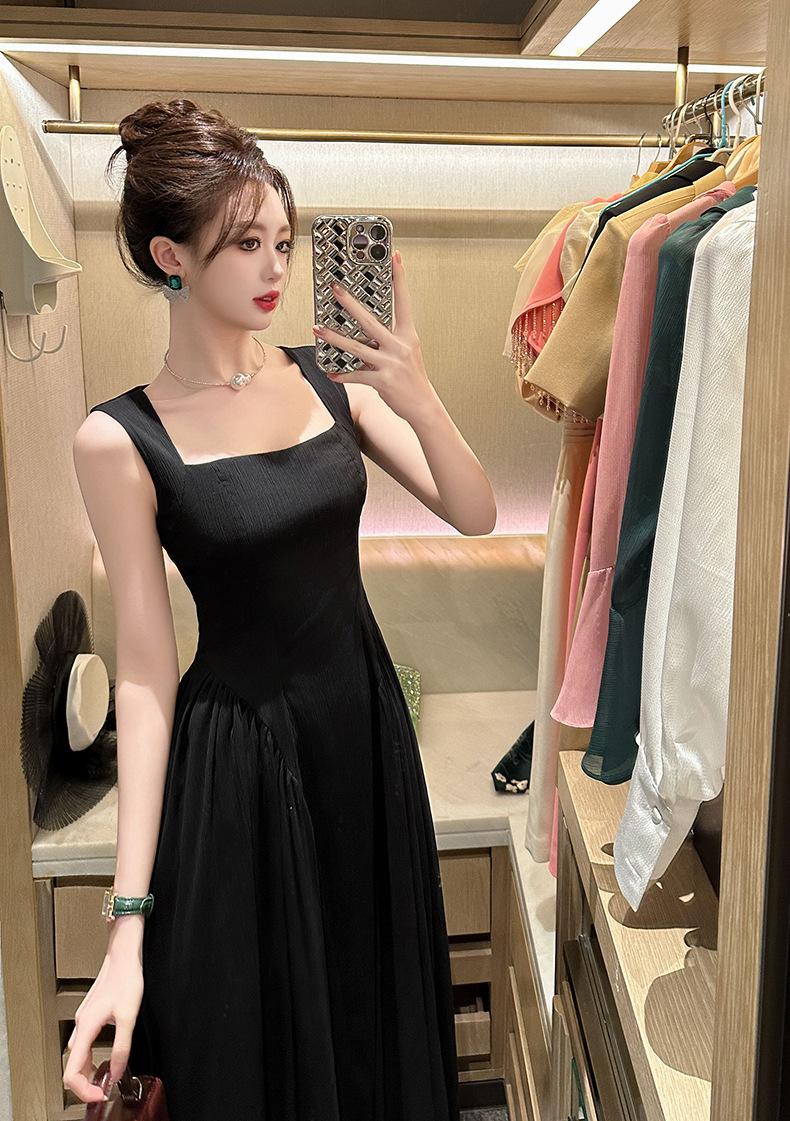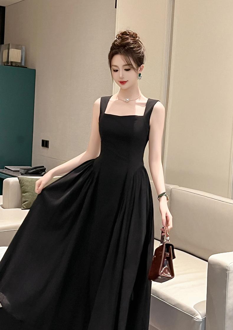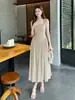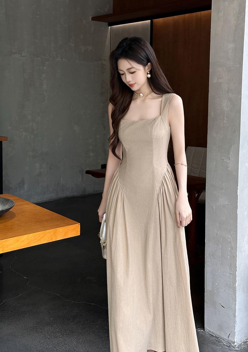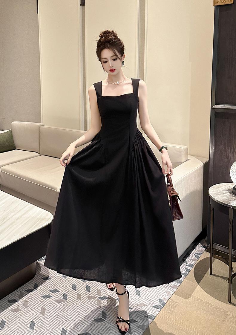 2025 Novo Vestido Longo Feminino de Verão Francês Decote Quadrado Cintura Plissada Cobrindo a Barriga Sem Mangas 9801