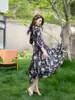 Rongtai elegante simples pescoço redondo Crepe de Chine Mulberry vestido de seda Feminino Lace-up Slim Floral Print Saia
