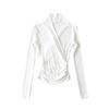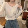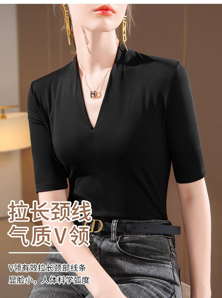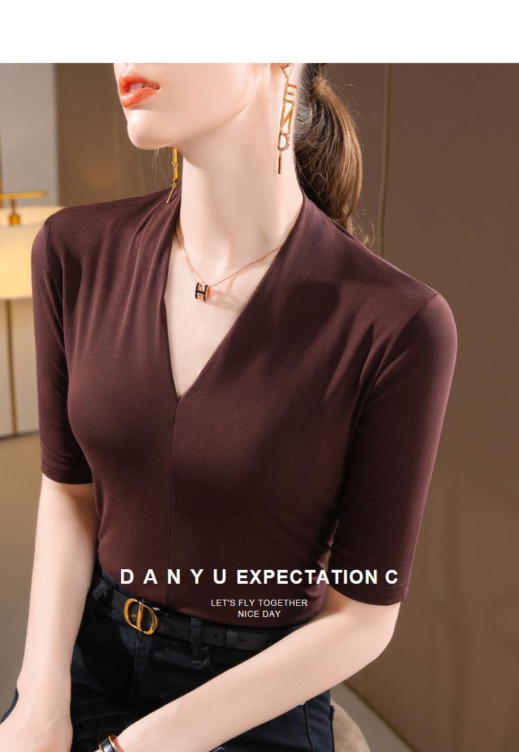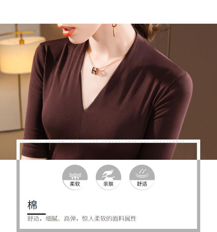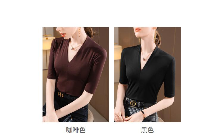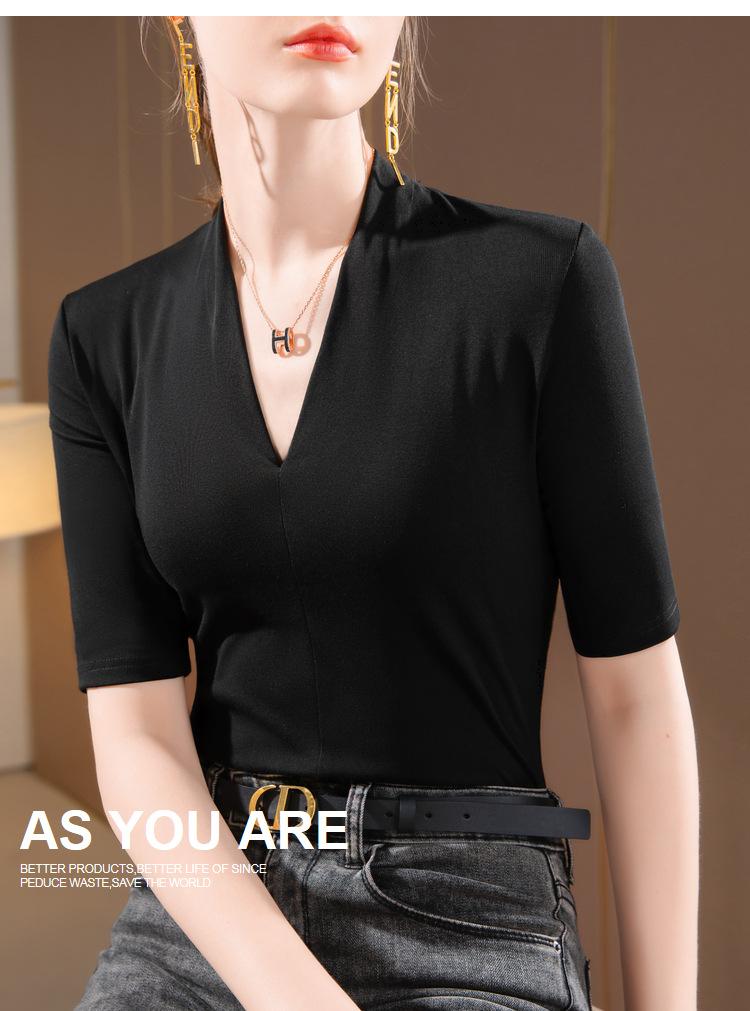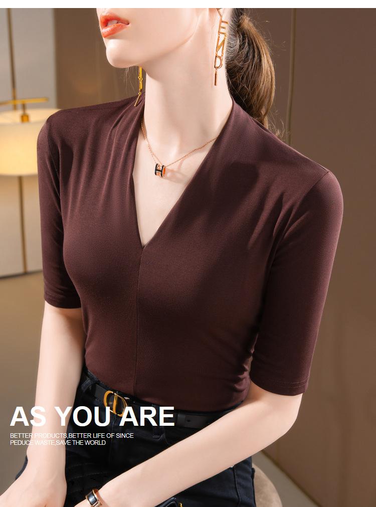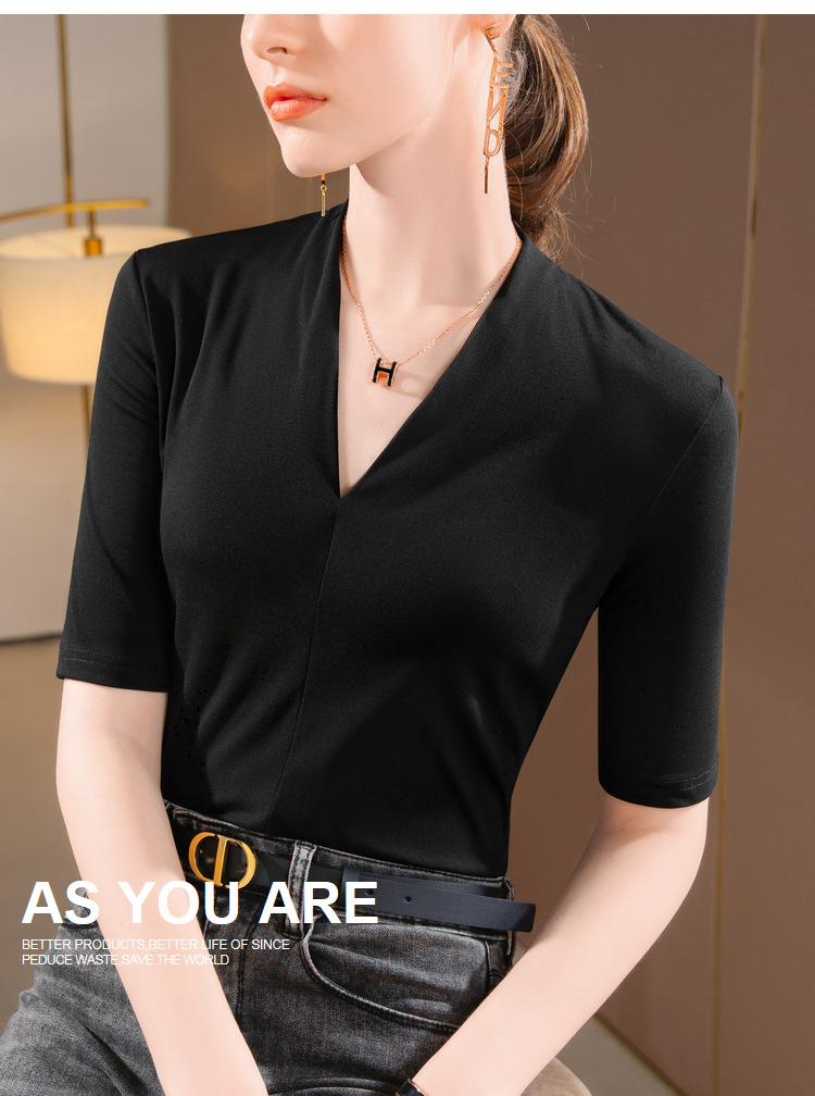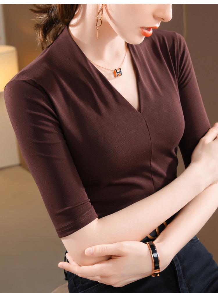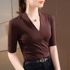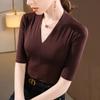 Camiseta de Manga Média para Mulheres 2025 Novo Estilo Elegante Decote em V Interna Elástica Blusa Modeladora Cintura Justa Sexy