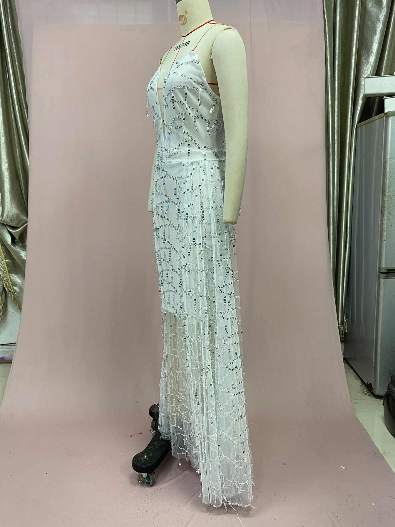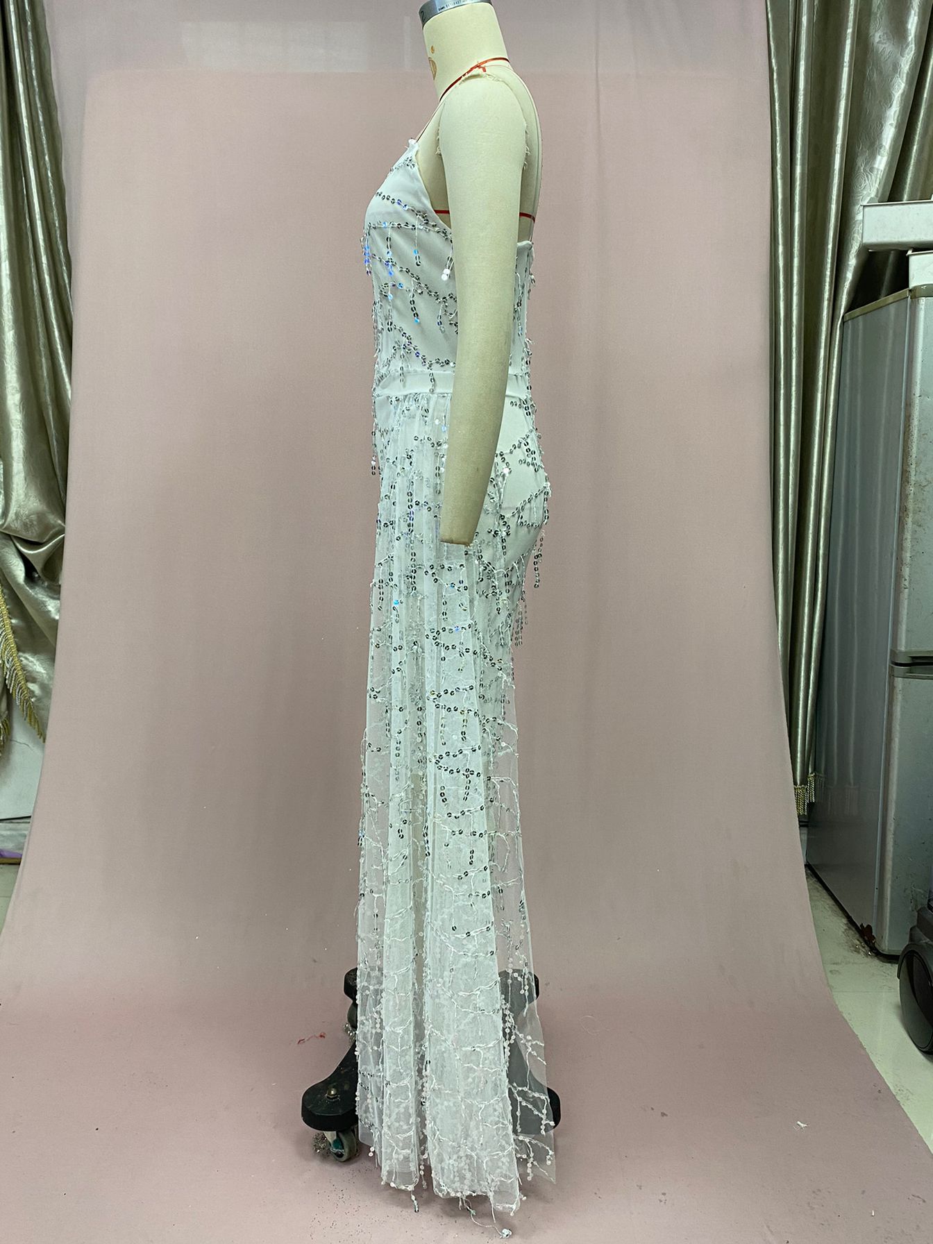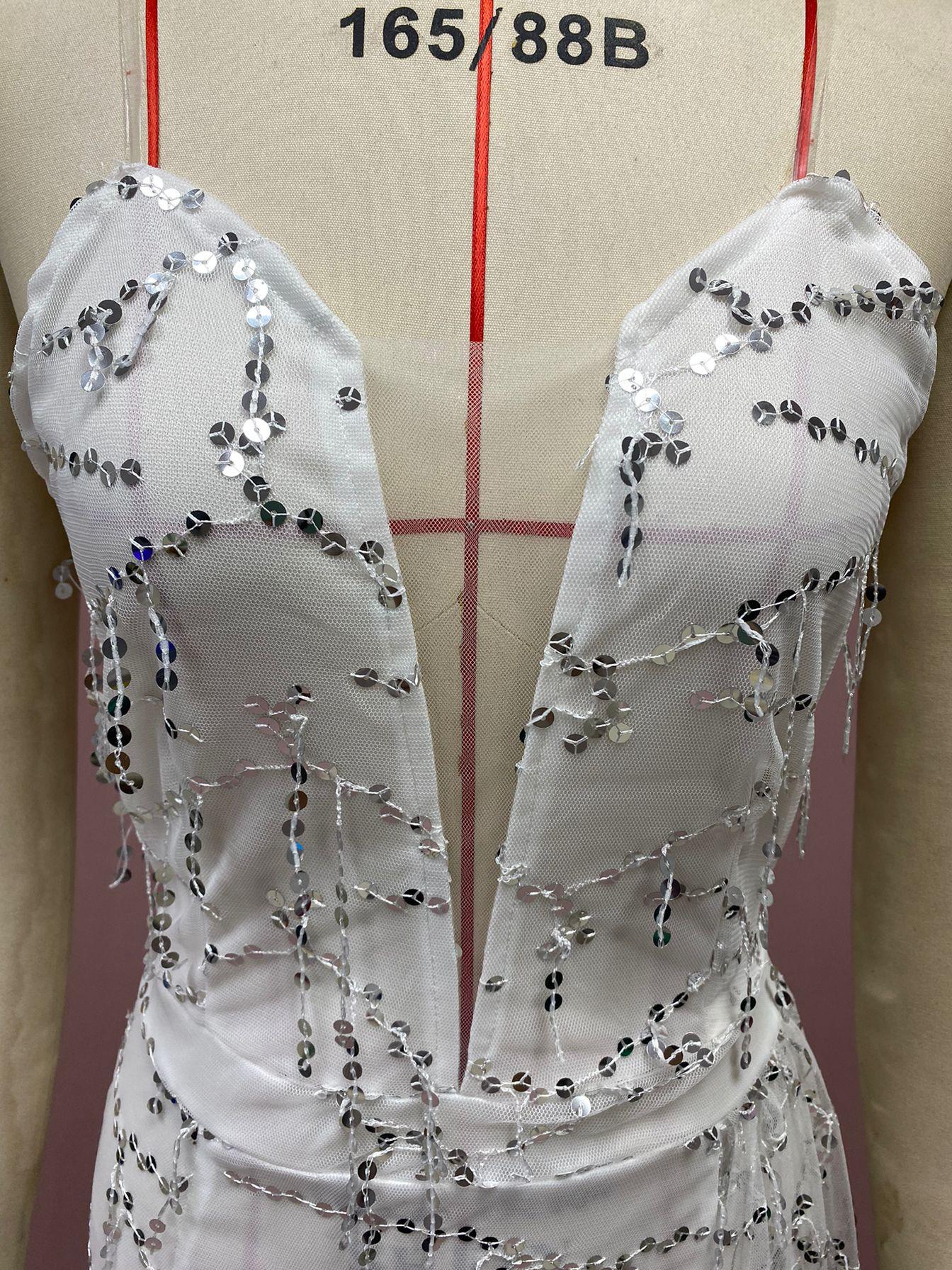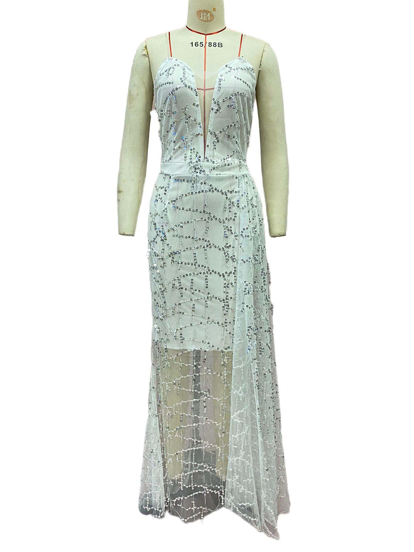 2025 Verão Transfronteiriço Novo Vestido Europeu e Americano de Alças Sexy Decote V Prata Quente Moda Vestido Sexy de Noite