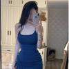 Ins Estilo Quente 2024 Europeu e Americano Sexy Cintura Afinando Look Alça Halter Cobre Quadril Grande Sem Costas Vestido Vermelho para Mulheres
