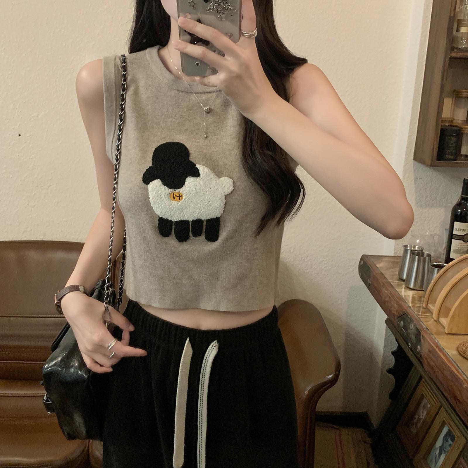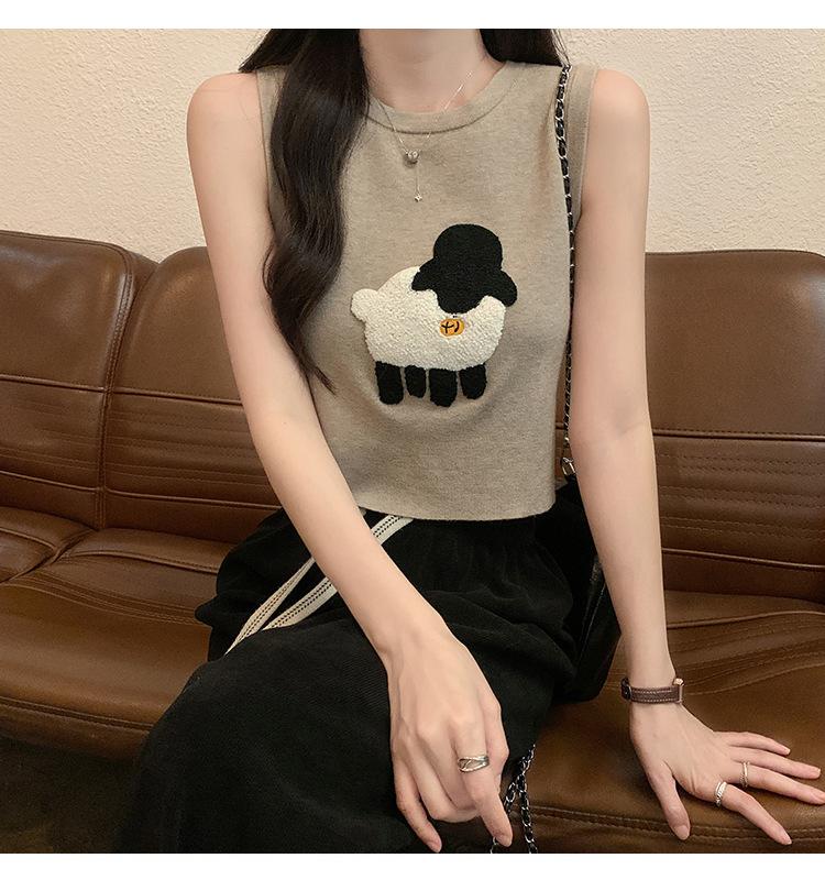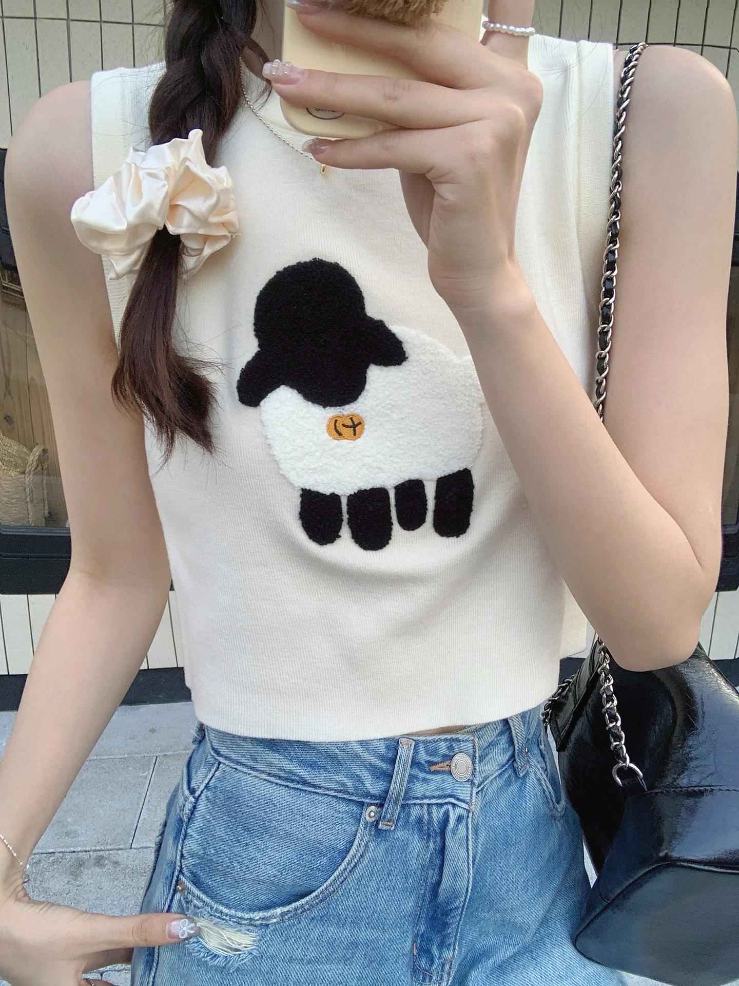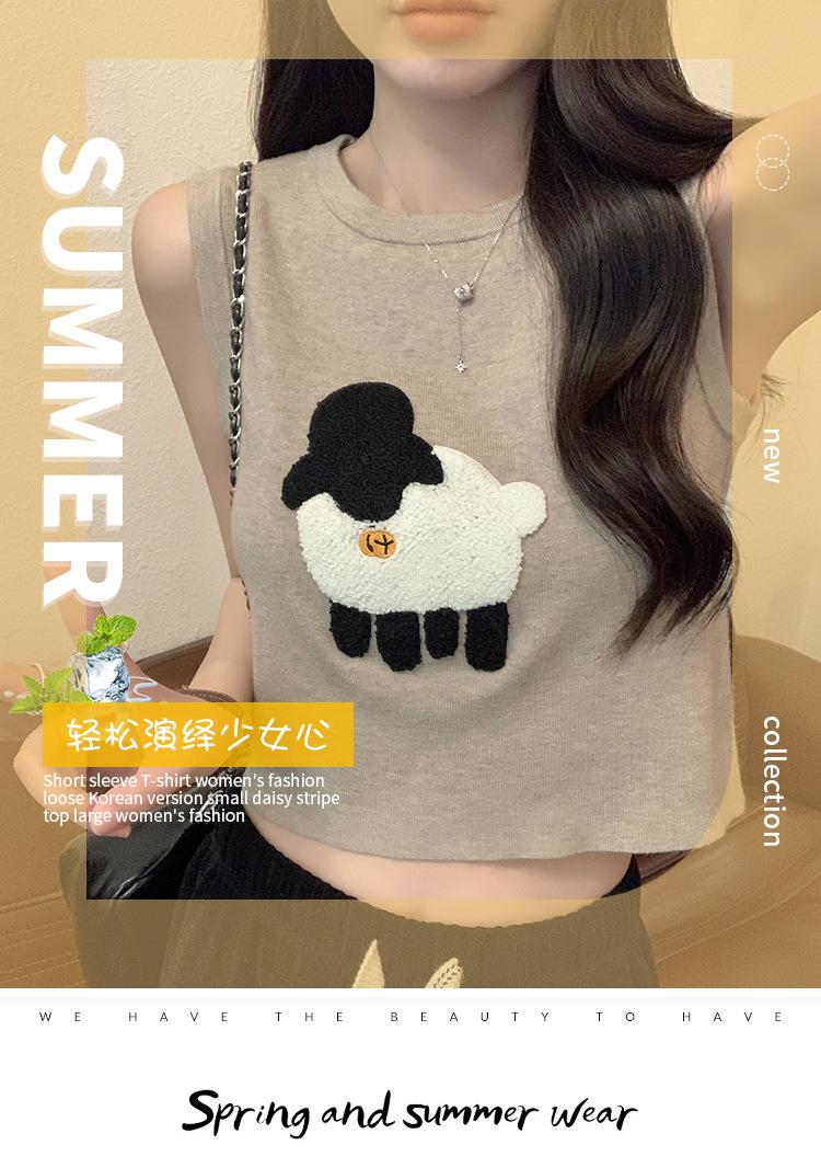 Cordeiro bordado curto malha colete feminino primavera e verão novo pescoço redondo design sentido puro desejo nicho empilhado mangas top