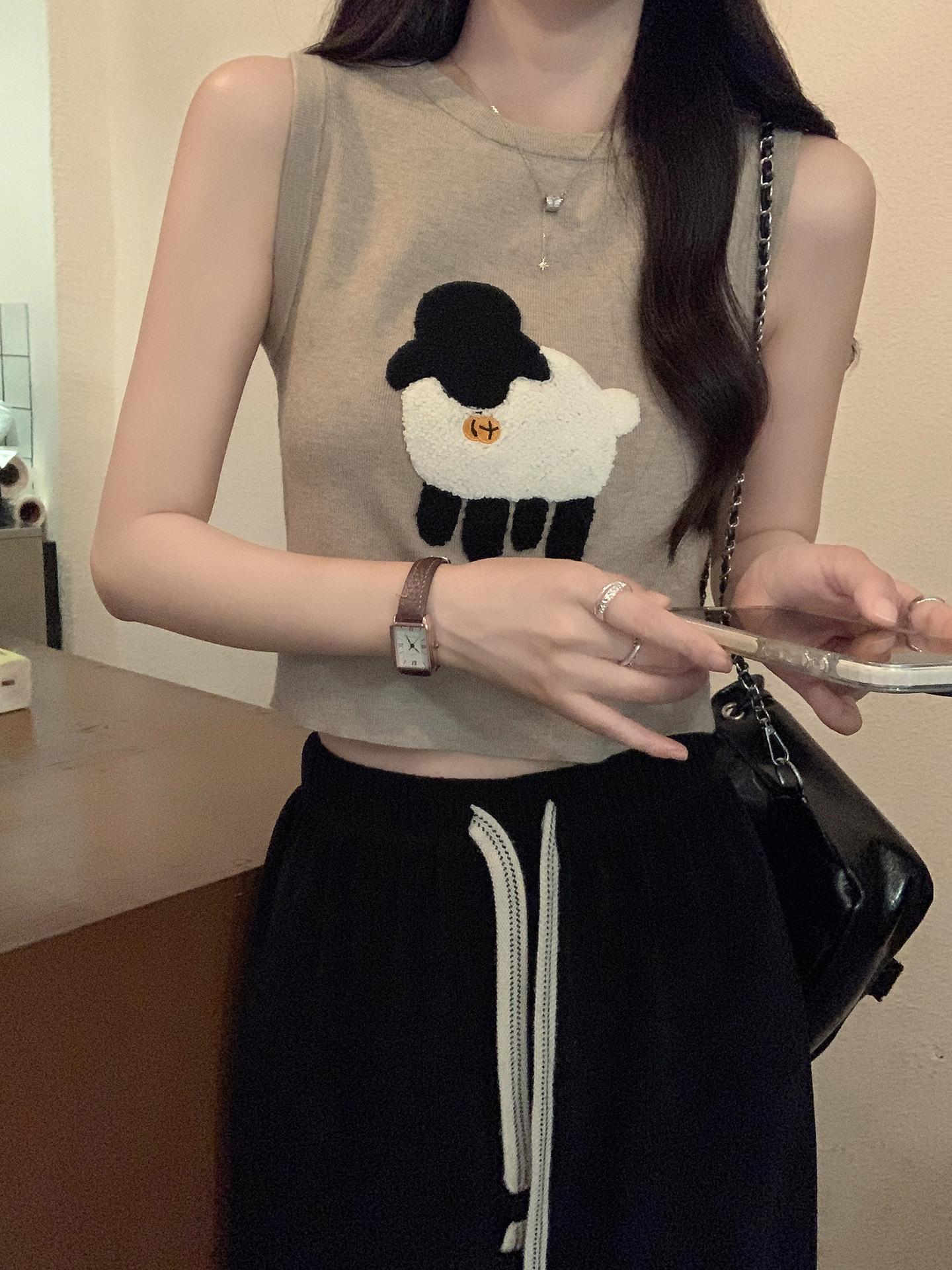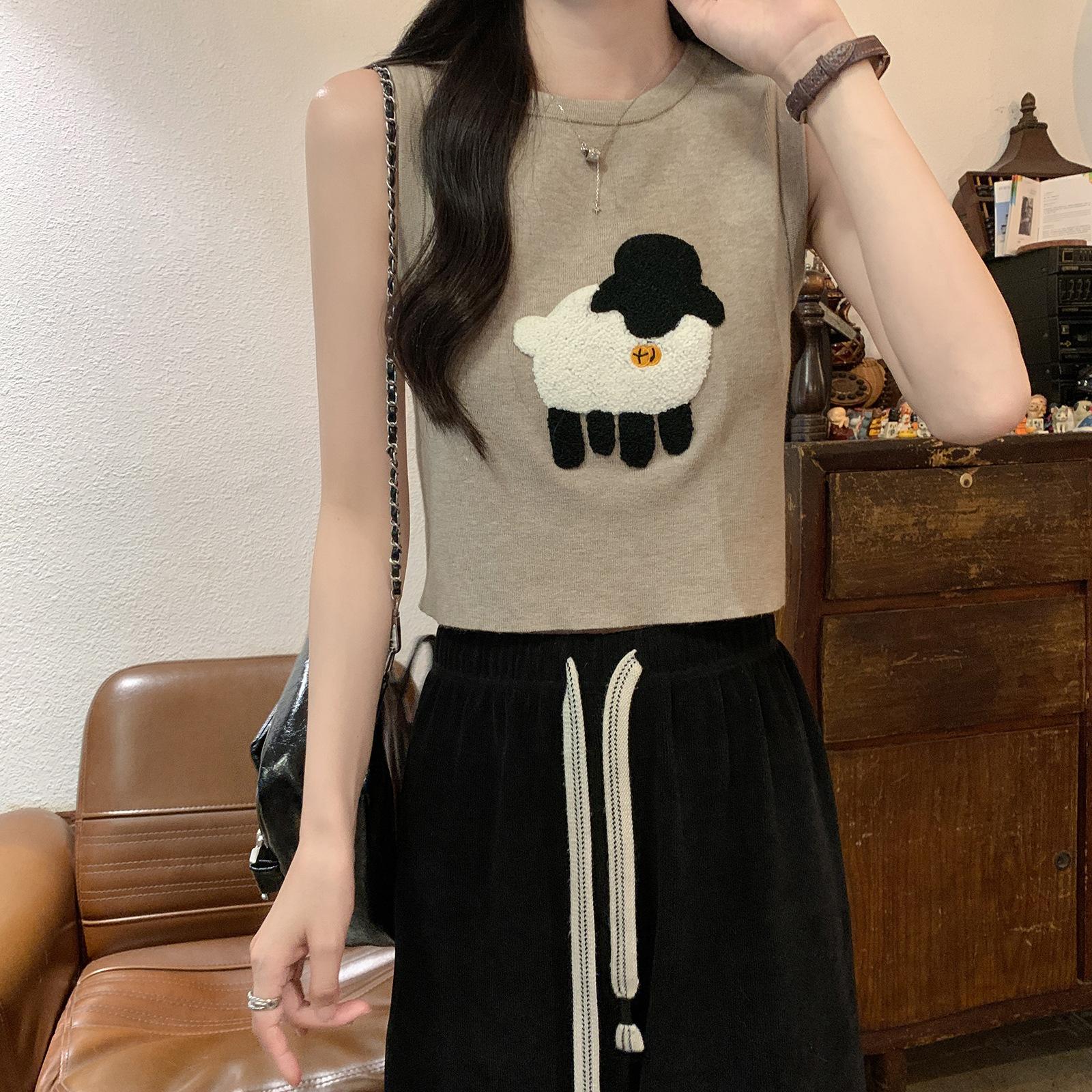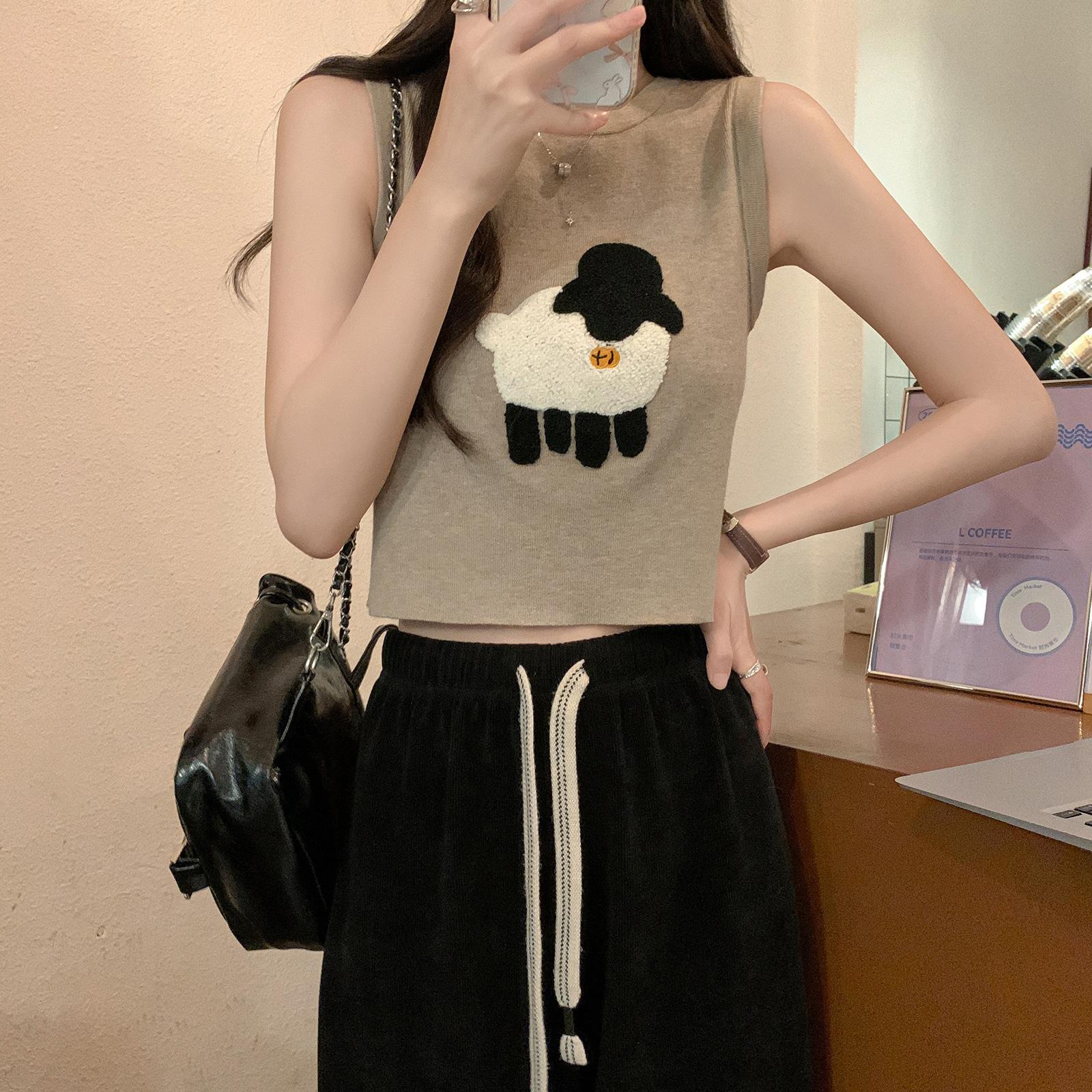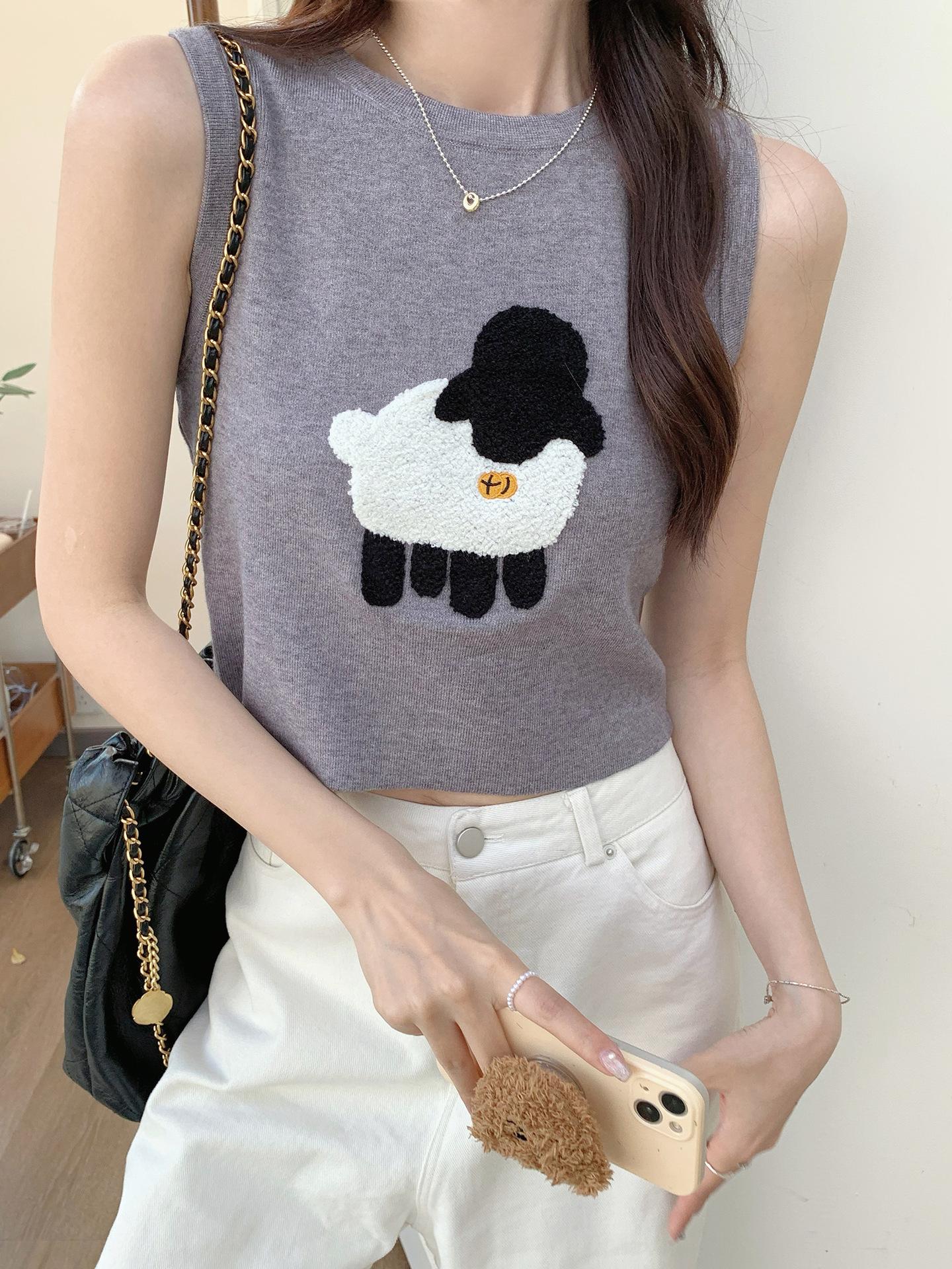Cordeiro bordado curto malha colete feminino primavera e verão novo pescoço redondo design sentido puro desejo nicho empilhado mangas top