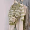 Camiseta feminina de manga curta listrada, gola polo, seda gelo, ombro reto, design de verão, nicho, camiseta solta de malha