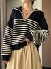 Suéter de Tricô com Listras e Decote V Mengzixi, Estilo Solto e Casual, Color-Blocking, Emagrecedor Outono e Inverno Suéter 30% Lã X270 Suéter
