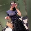 Qualidade malha vintage carta esticar curto malha suéter tencel fino slim-fit emagrecer camisa base de manga curta