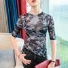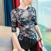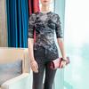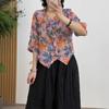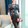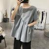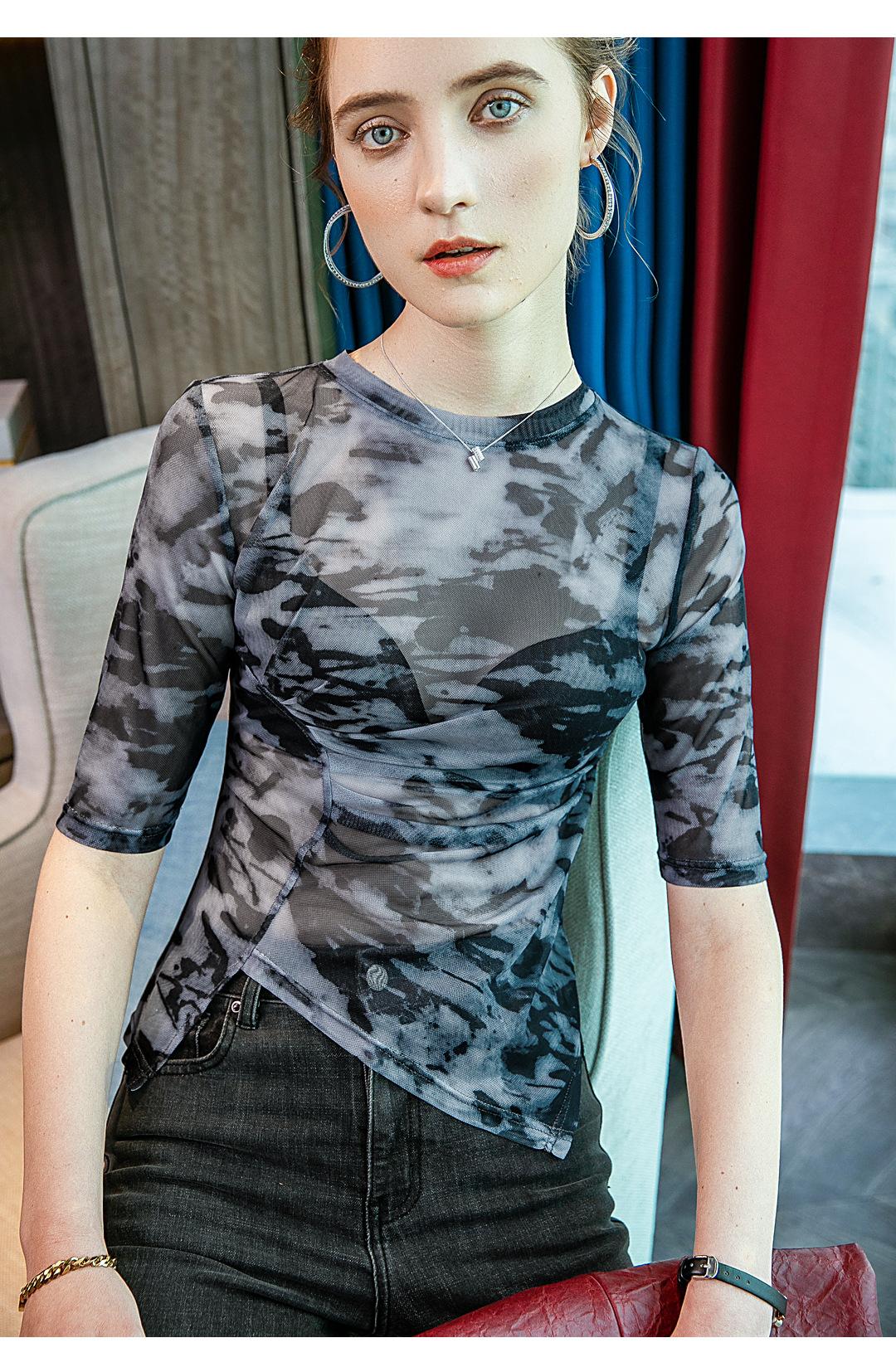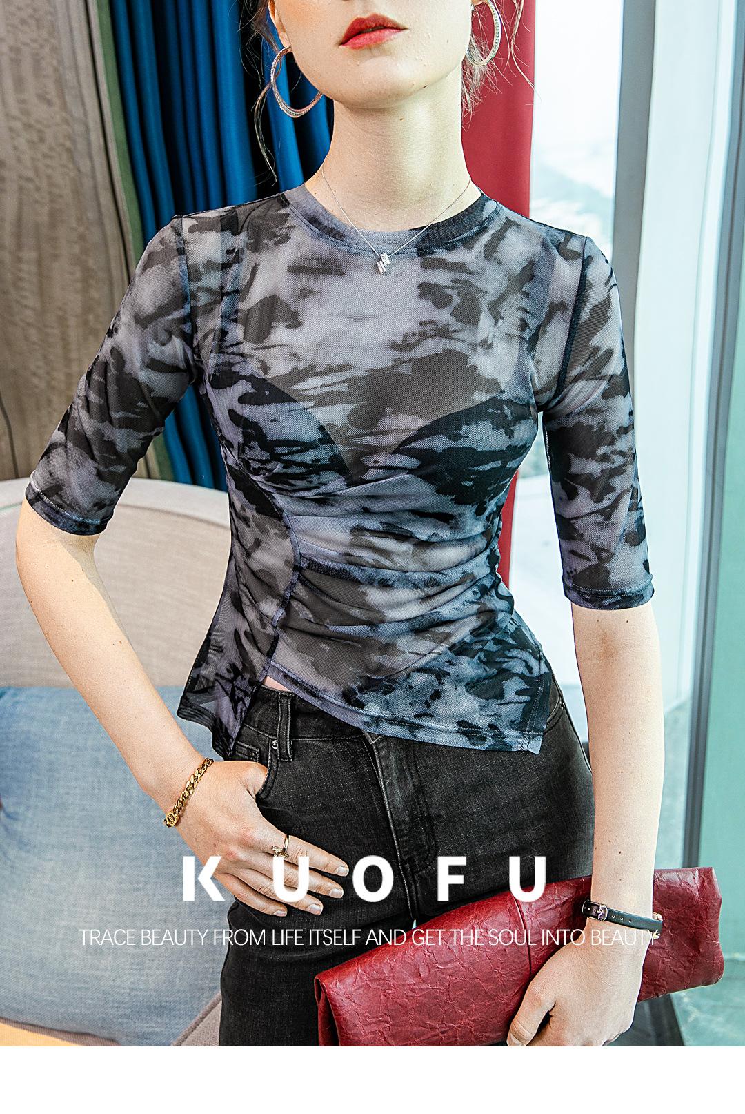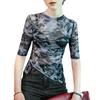 Primavera e Verão Nova Malha Estampada Meia Manga Top Camisa Pequena plissada Irregular
