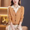 Suéter Confortável Estilo Comum Primavera 2025 Novo Estilo Lapela Falso Duas Peças Design de Botão Diagonal em Bloco de Cores para Mulheres