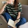 Estilo coreano Retro Estilo Ocidental All-Match Manga Curta Decote Redondo Pulôver Curto Seda de Gelo Listrado Top de Malha