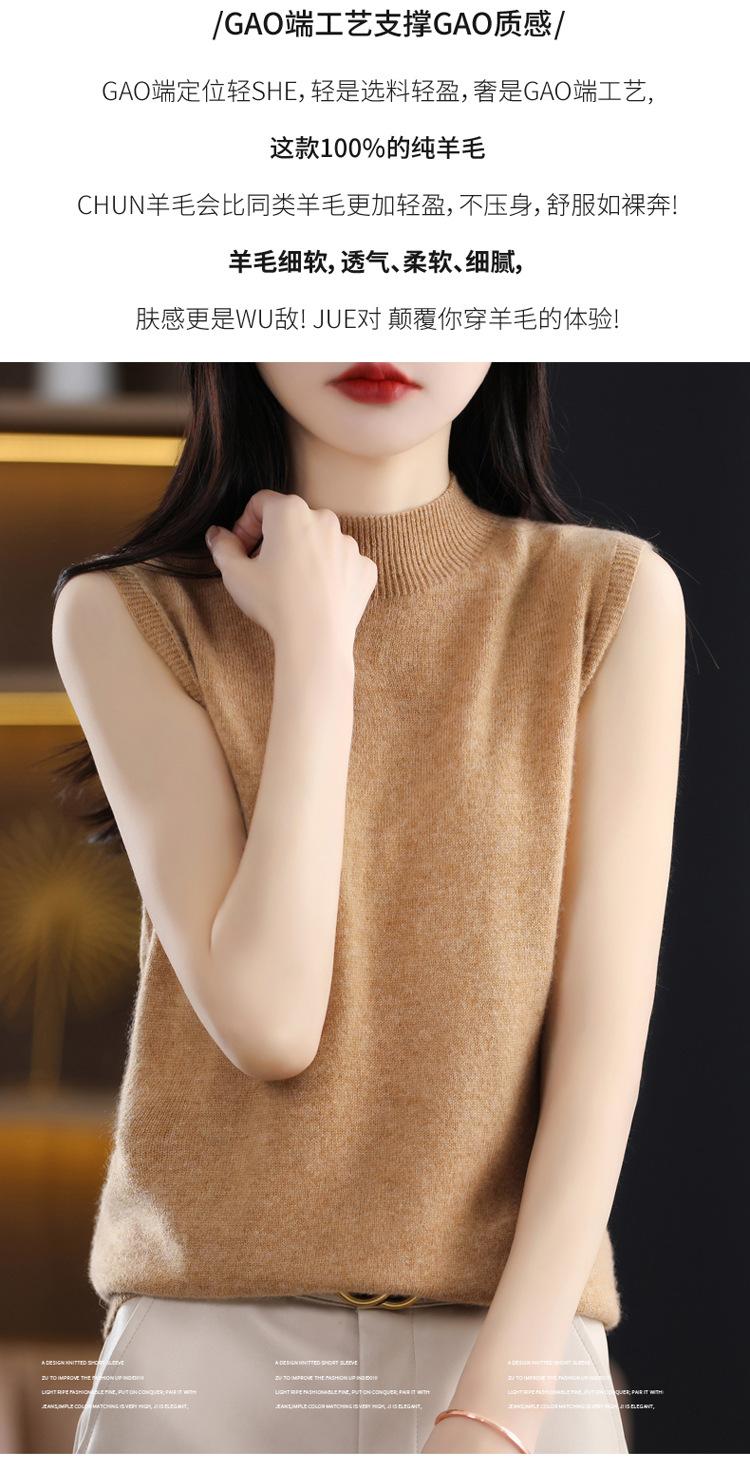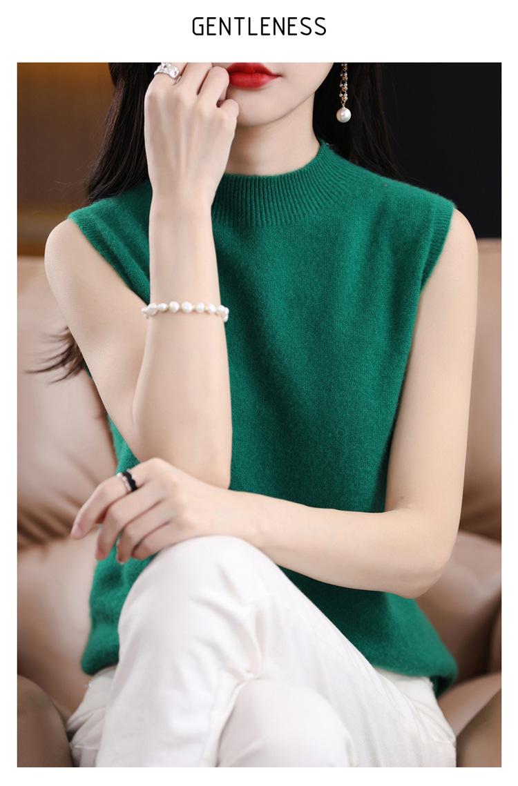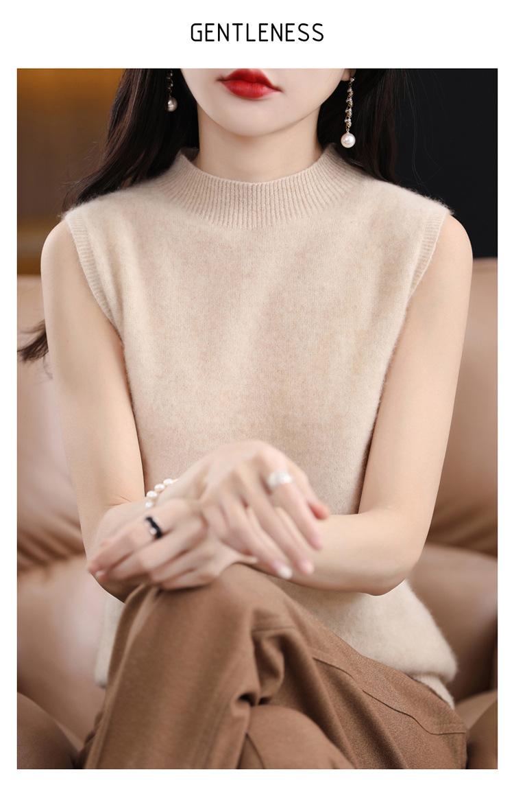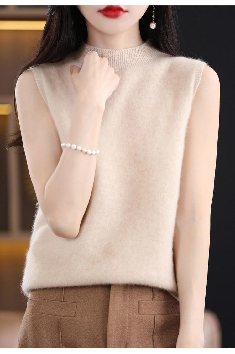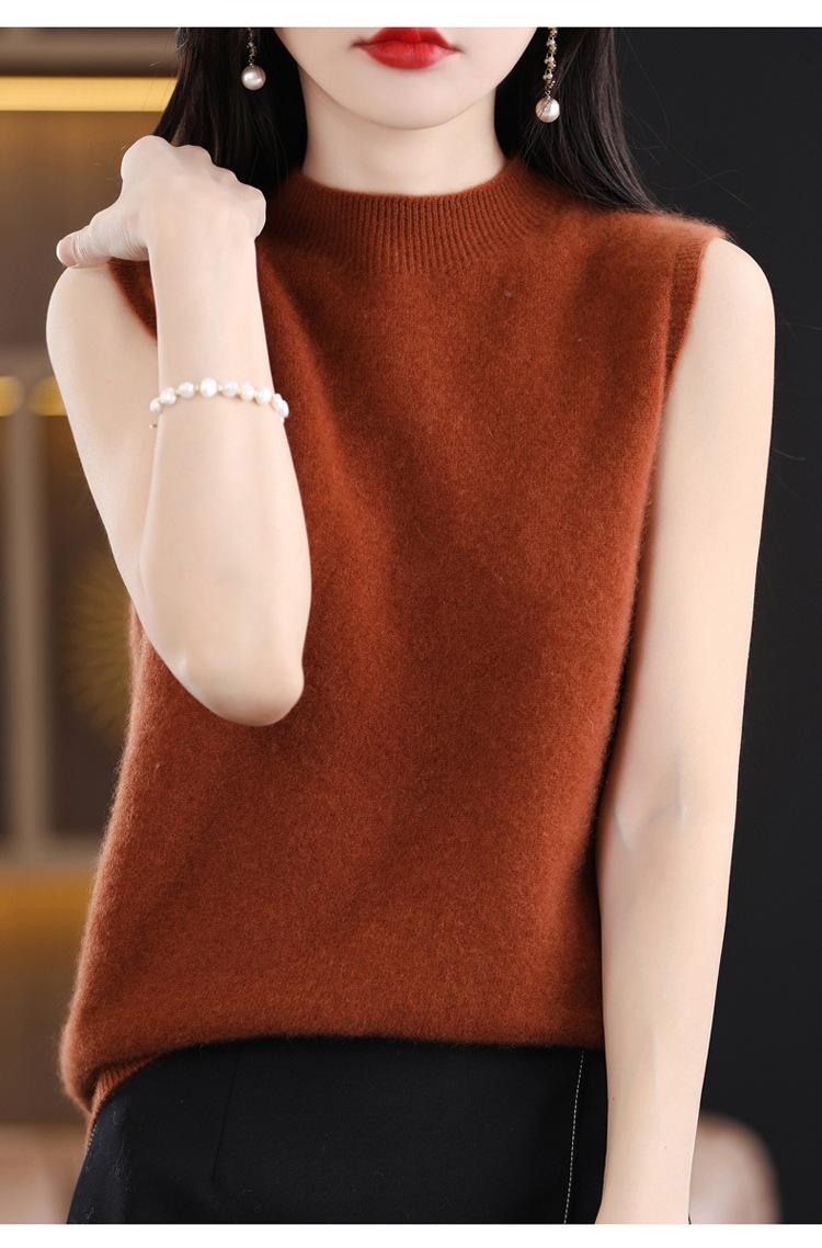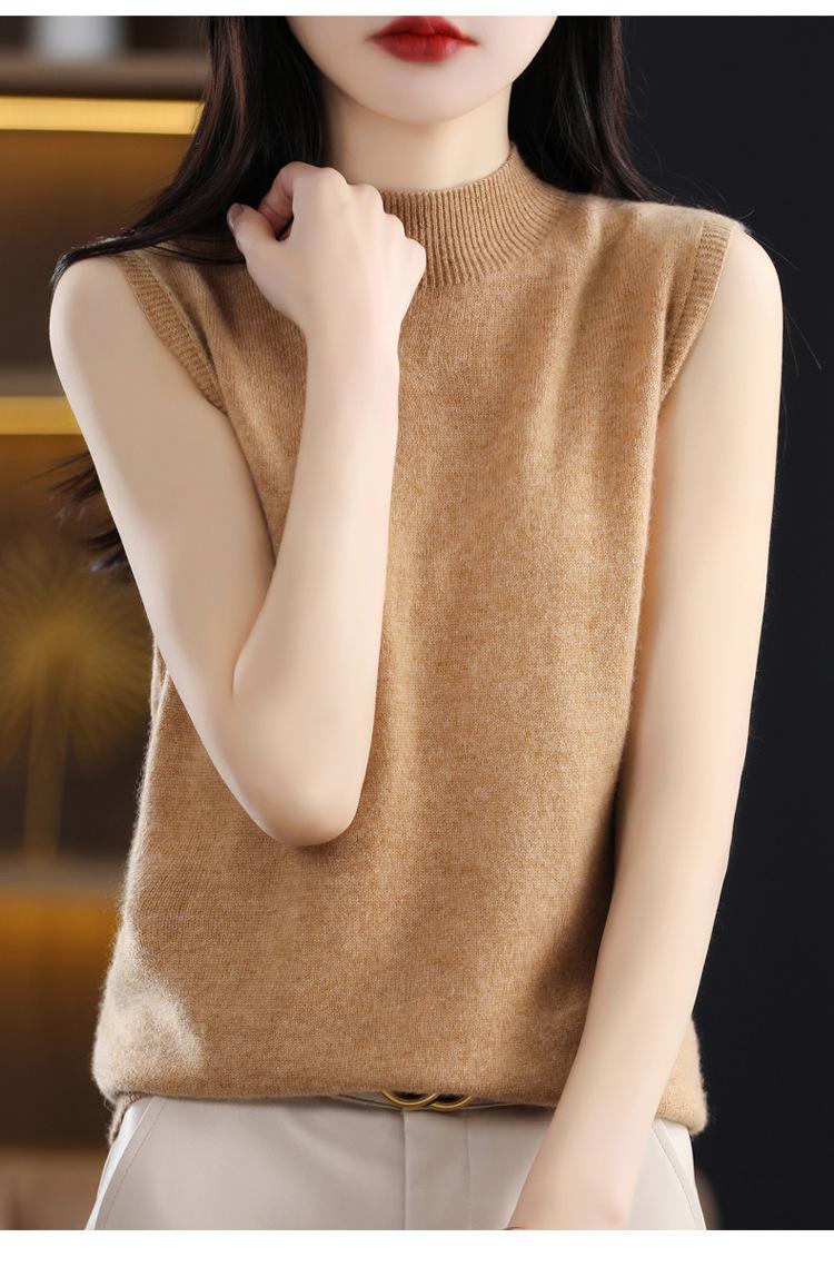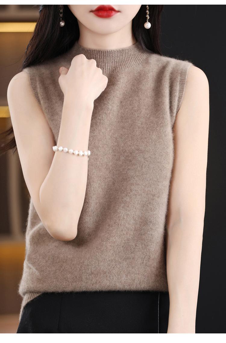 Primeira Linha Pronta para Vestir 100% Lã Pura Outono e Inverno 2025 Novo Pulôver de Tricô Feminino Gola Média Curto Sem Mangas