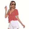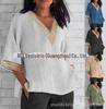 Estilo europeu e americano simples e elegante ombro plissado linho convidado V-neck meia manga solta casual elegante camisa top