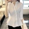 Camisas de Verão Femininas 2025 Novo Estilo Coreano Moda de Verão Elegantes Blusas de Manga Média Modeladoras Acinturadas Camisas de Cor Sólida