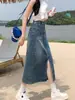 Saia jeans cinza retrô verde Saia feminina primavera e verão mid-length emagrecendo cintura alta A- linha saia de quadril dividida