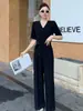 Novo estilo chinês estilo nacional fivela V-neck macacão feminino verão estilo europeu elegante cintura emagrecendo calças de perna larga