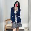 Roupa Feminina Estilo Francês Início de Outono Novo Cardigã Jacquard Trevo Carta Elegante Moda Ladylike Casual Conjunto Vestido