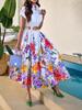 2023 Camisa Europeia e Americana Collar Grande Swing Posicionamento Flor Estampa Manga Curta Vestido de Botão com Cinto
