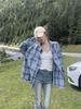 Estilo americano retrô azul xadrez camisa de manga comprida casaco feminino outono Nova camisa casual solta top de comprimento médio