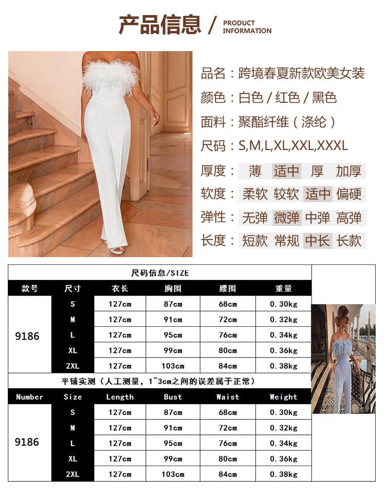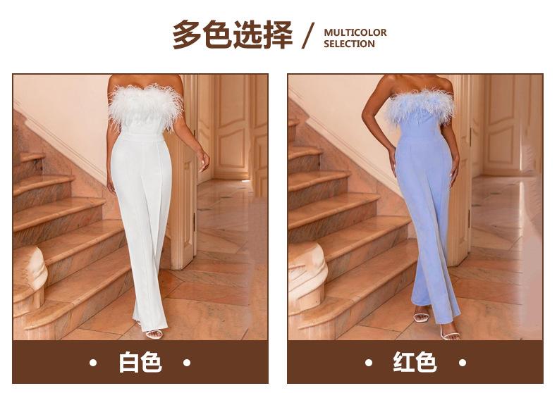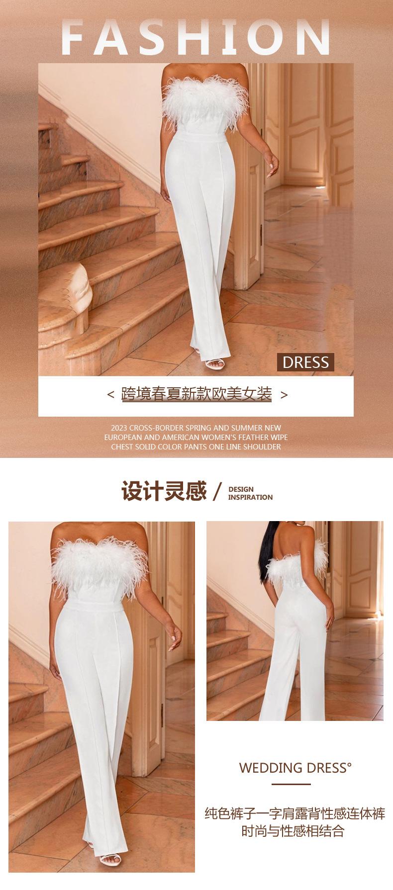 2025 Primavera e Verão Novo Roupa Europeia e Americana Top Tubinho de Pena Calças Cor Pura Um Ombro Sem Costas Macacão Sexy