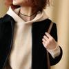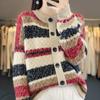 Cardigã Feminino Solto de Tricô de Lã com Listras de Caxemira de Jacquard Pesado Outono e Inverno 2025 Gola Redonda Cor Contrastante Casaco de Malha de Manga Longa