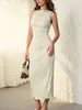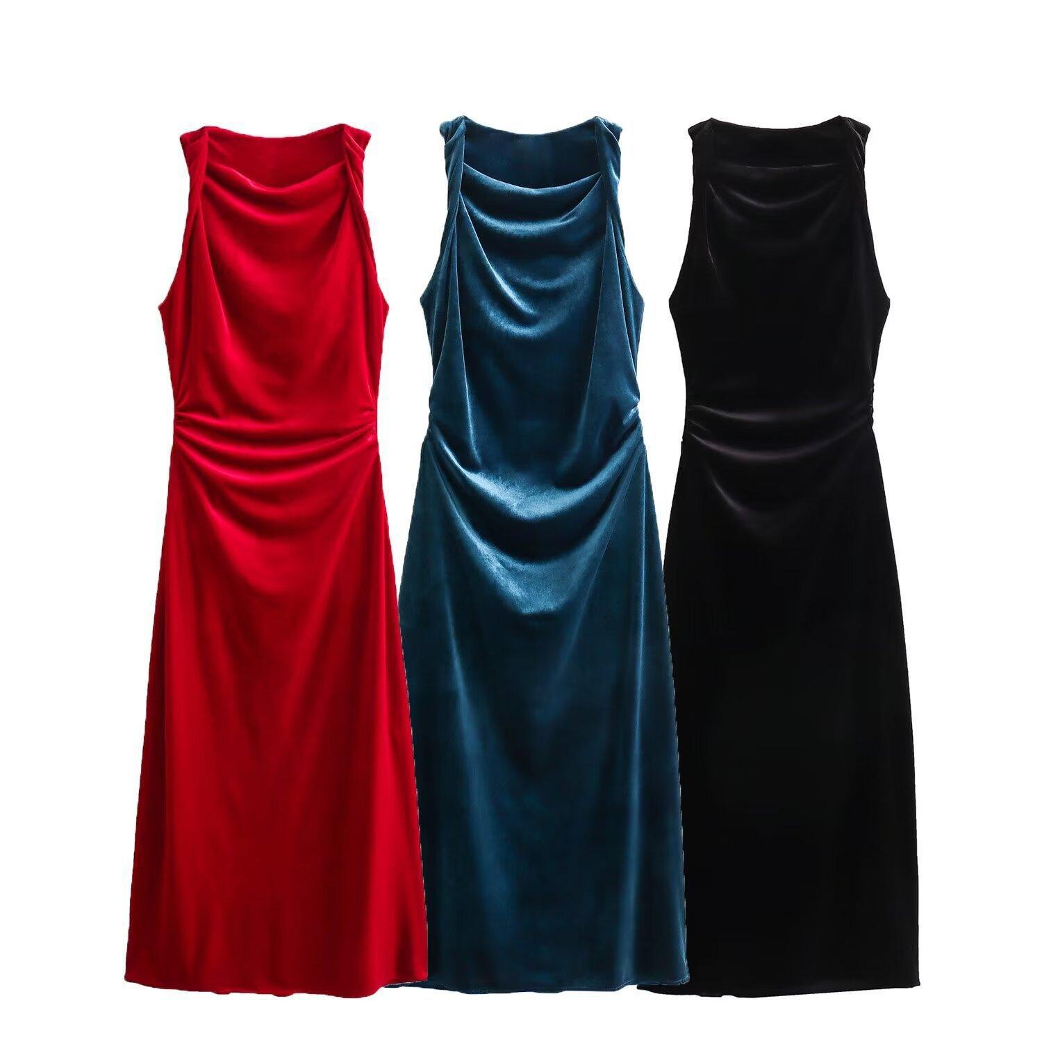 Estilo europeu e americano 2023 outono e inverno novas roupas femininas cor sólida pullover pescoço redondo sem mangas plissado vestido de veludo fino