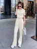 Conjunto Esportivo Casual Europeu para Mulheres 2025 Primavera & Outono Nova Moda High-End Roupa de Trabalho Cardigan Calças de Perna Larga Conjunto de Duas Peças