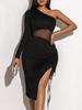 Novo Estilo de Verão 2024 Vestido Justo Transparente com Cordão Europeu e Americano Ombro Inclinado Manga Longa Renda Malha Modelador de Corpo Saia