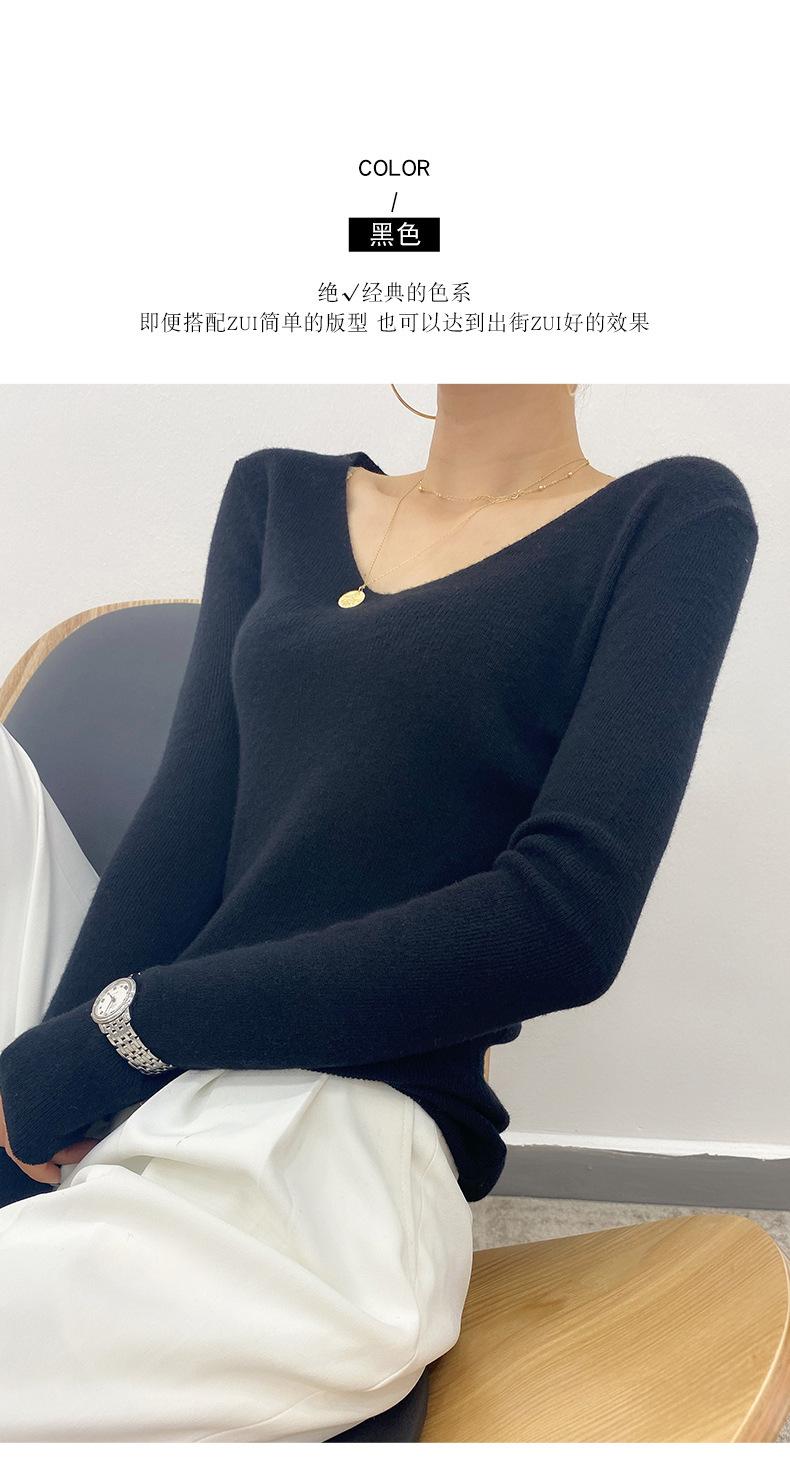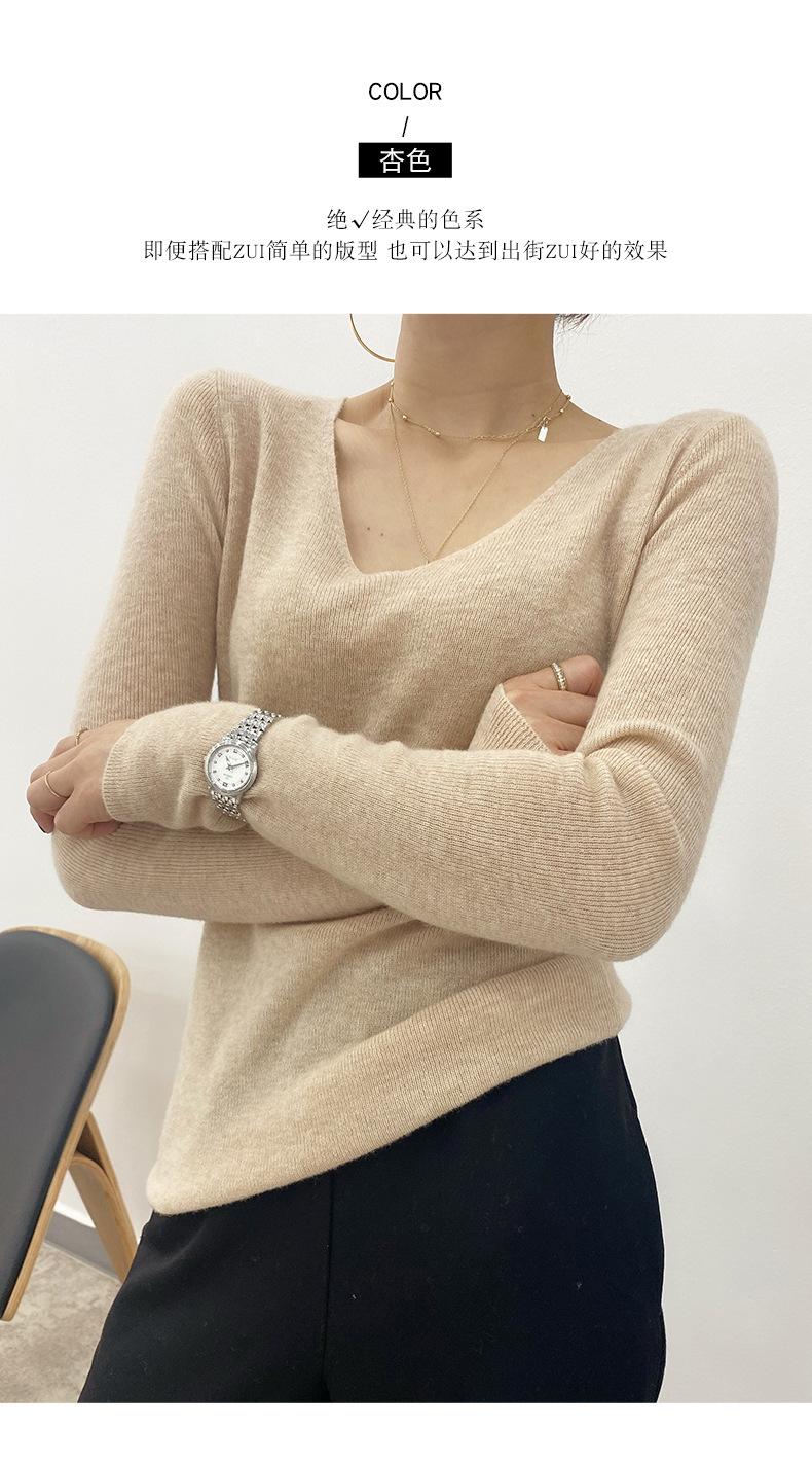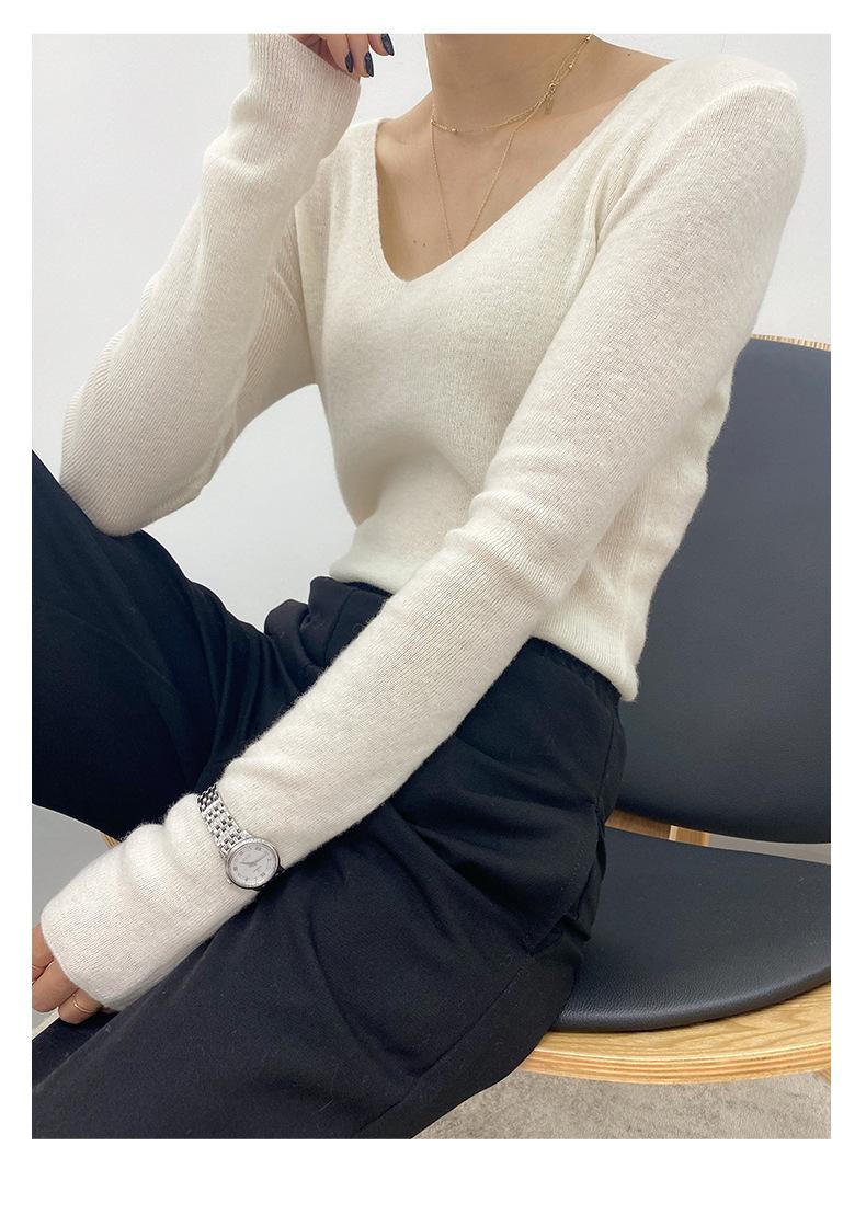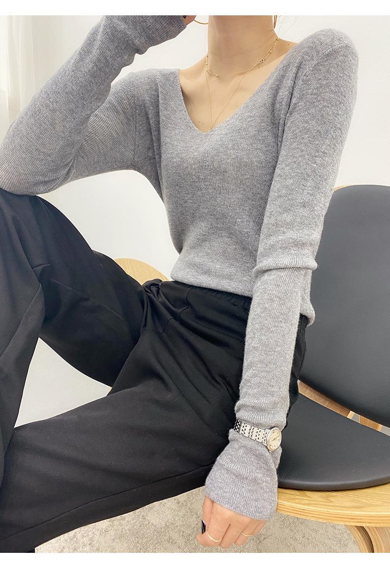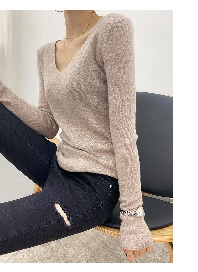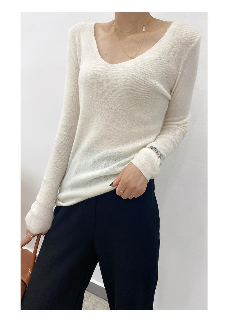Suéter de Caxemira Novo Outono e Inverno 2025 Feminino Gola V Cor Sólida Ligeiramente Transparente Ajuste Slim Lã Suéter Base Tricotado Mais Fácil de Combinar