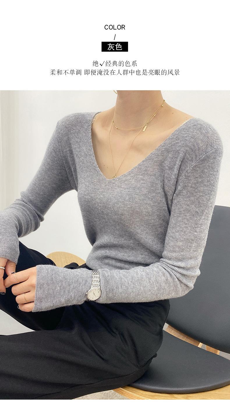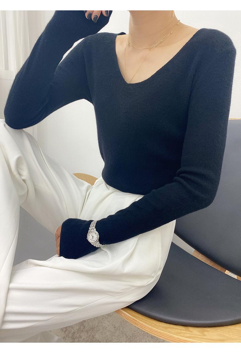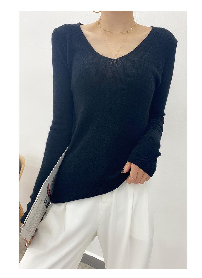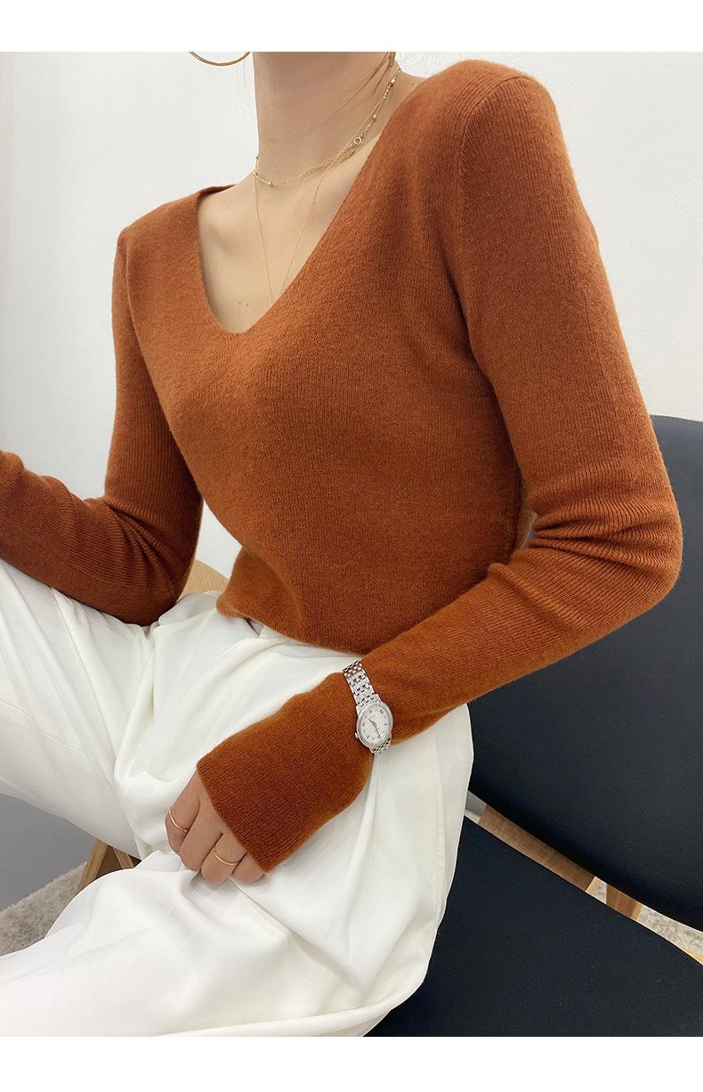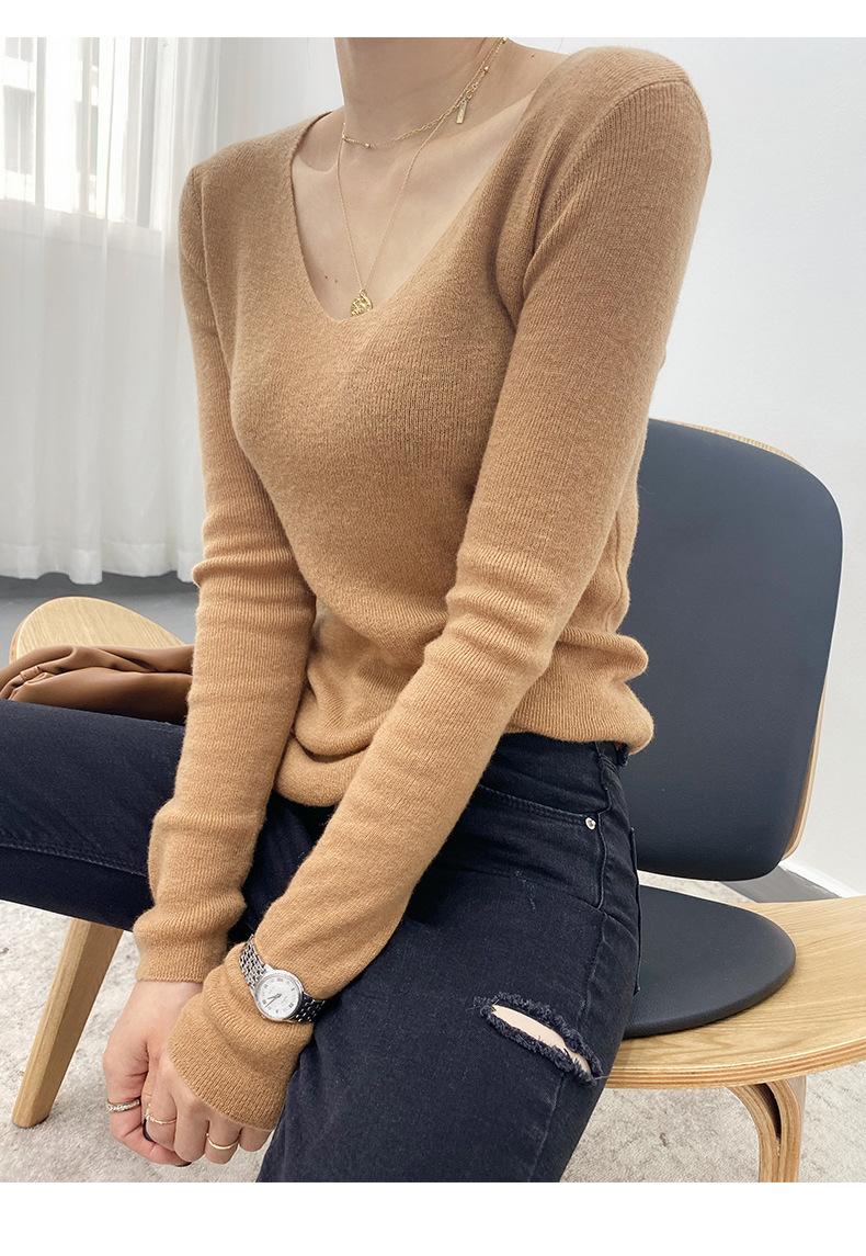 Suéter de Caxemira Novo Outono e Inverno 2025 Feminino Gola V Cor Sólida Ligeiramente Transparente Ajuste Slim Lã Suéter Base Tricotado Mais Fácil de Combinar