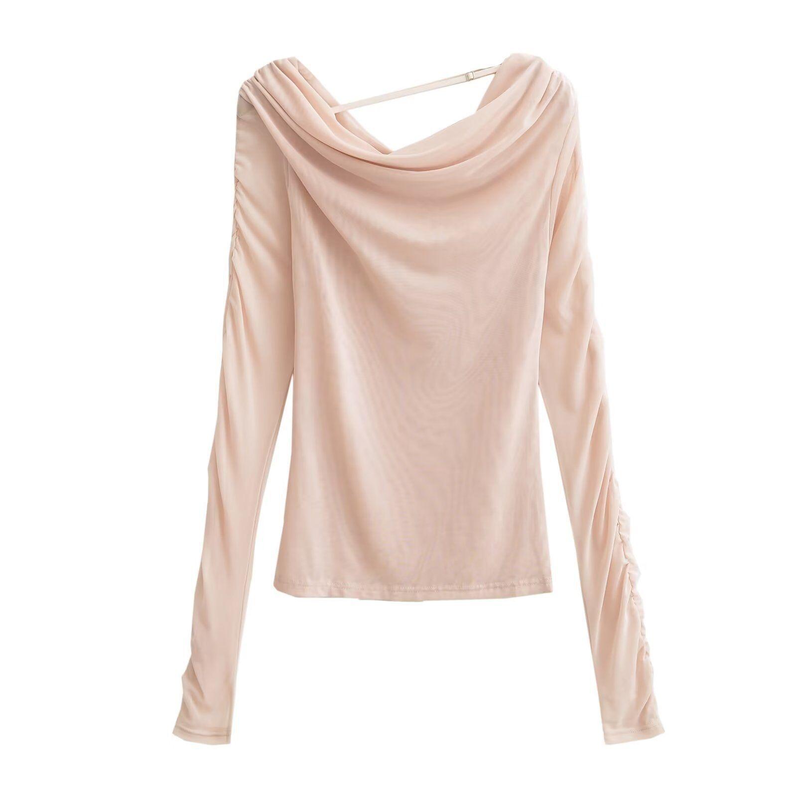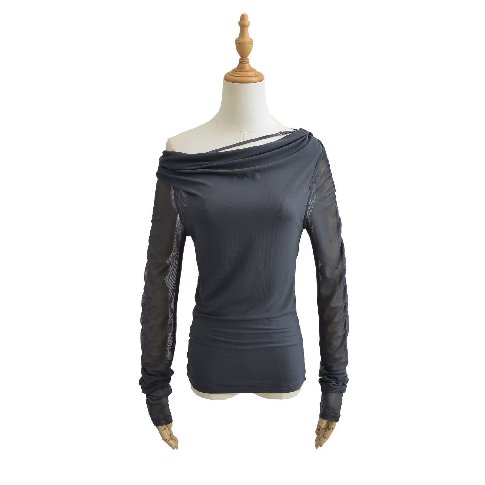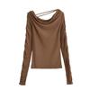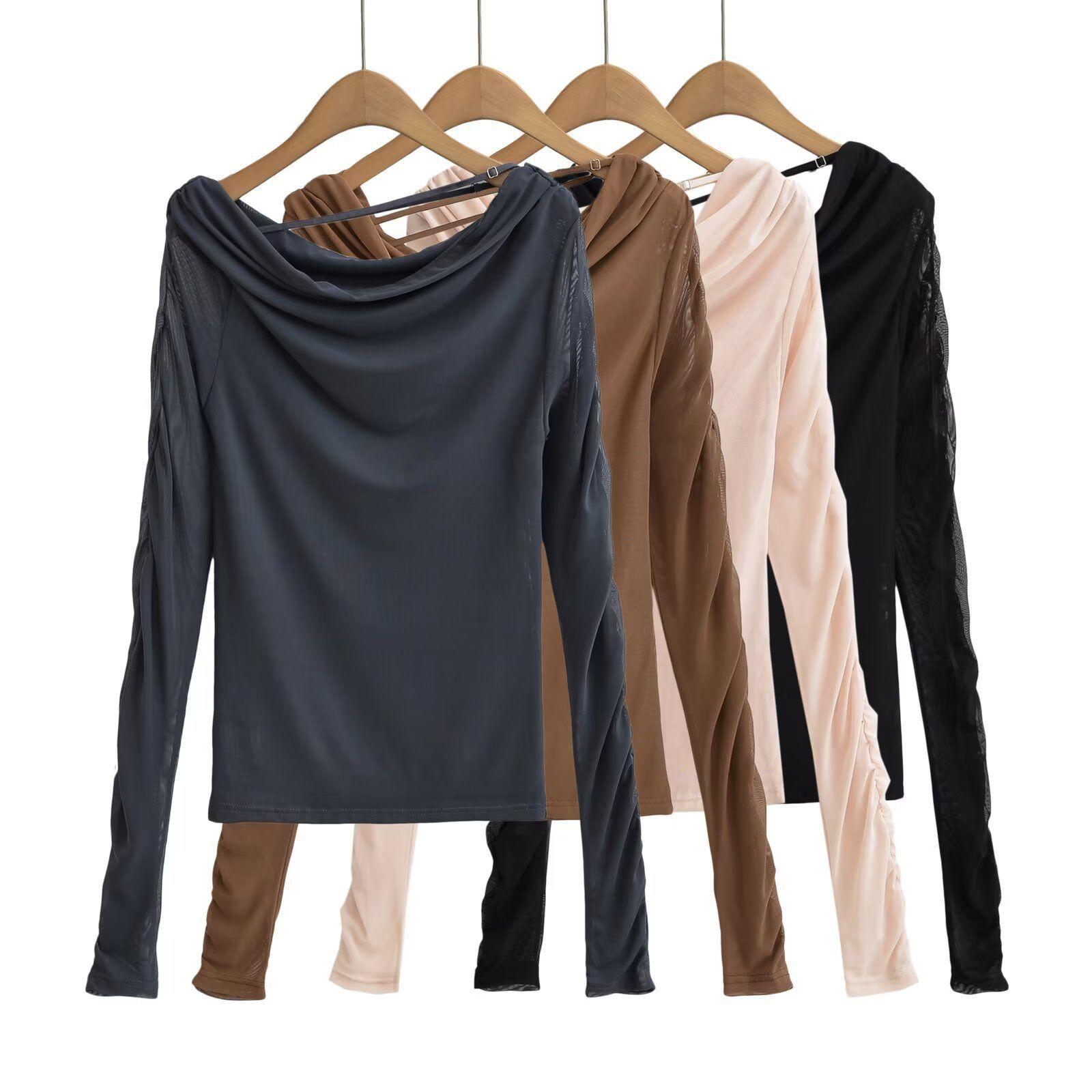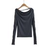 T-shirt de malha de manga comprida estilo europeu e americano off-shoulder para mulheres 2023 outono novo hot girl slim-fit slimming bottoming shirt top