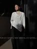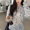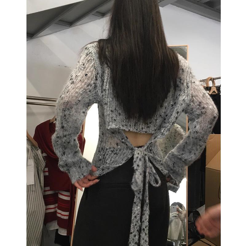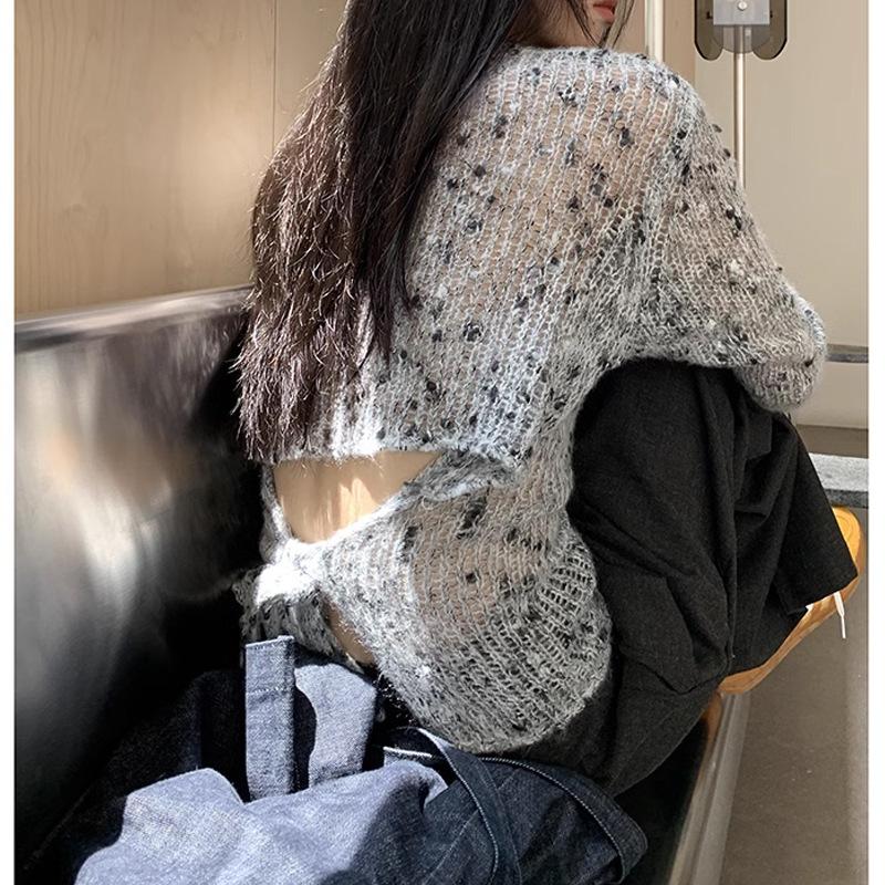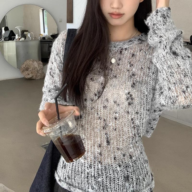 Treze Linhas Outono e Inverno Novo Top Tricotado de Agulha Grossa de Manga Comprida Solto Feminino Pontos Pretos de Partículas Grandes Decote Redondo Vazado Mulheres