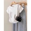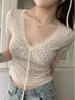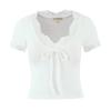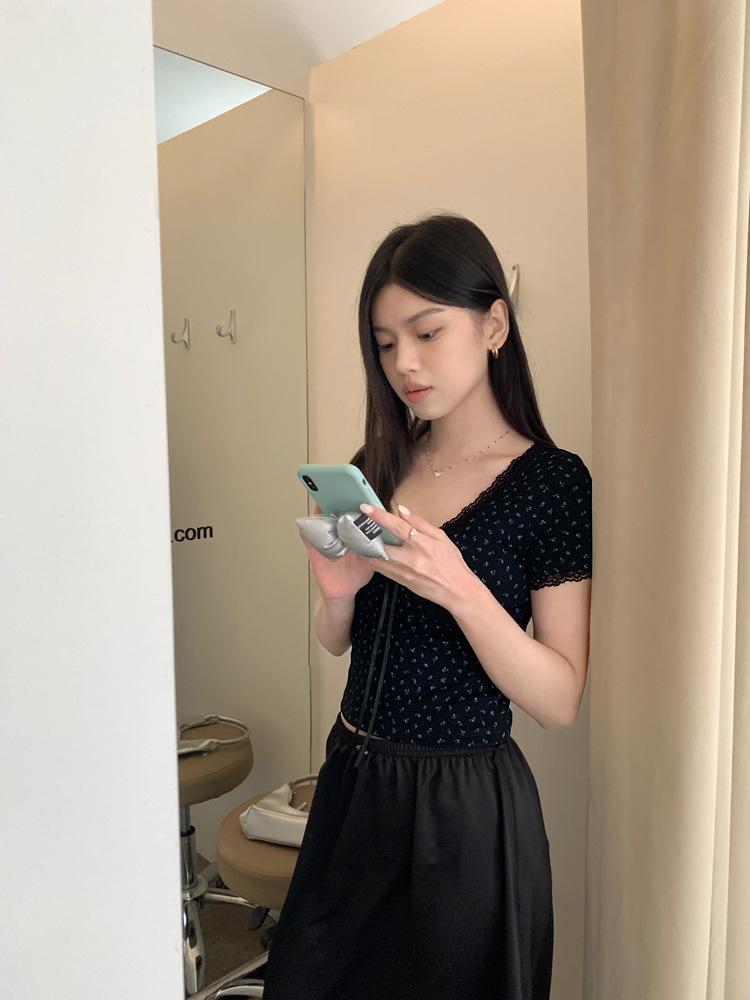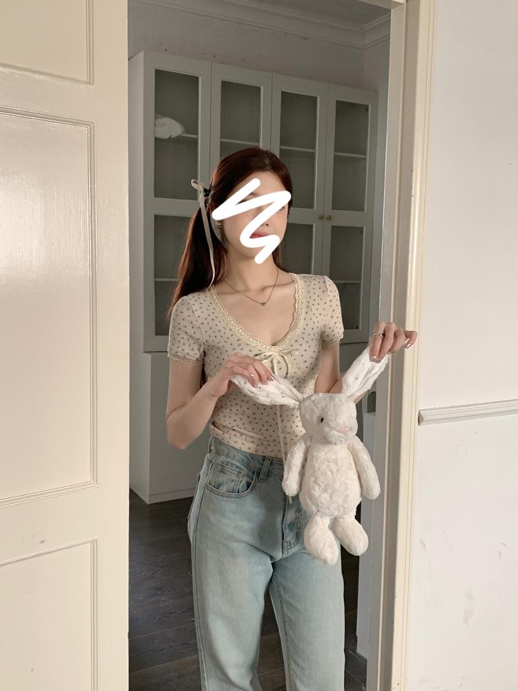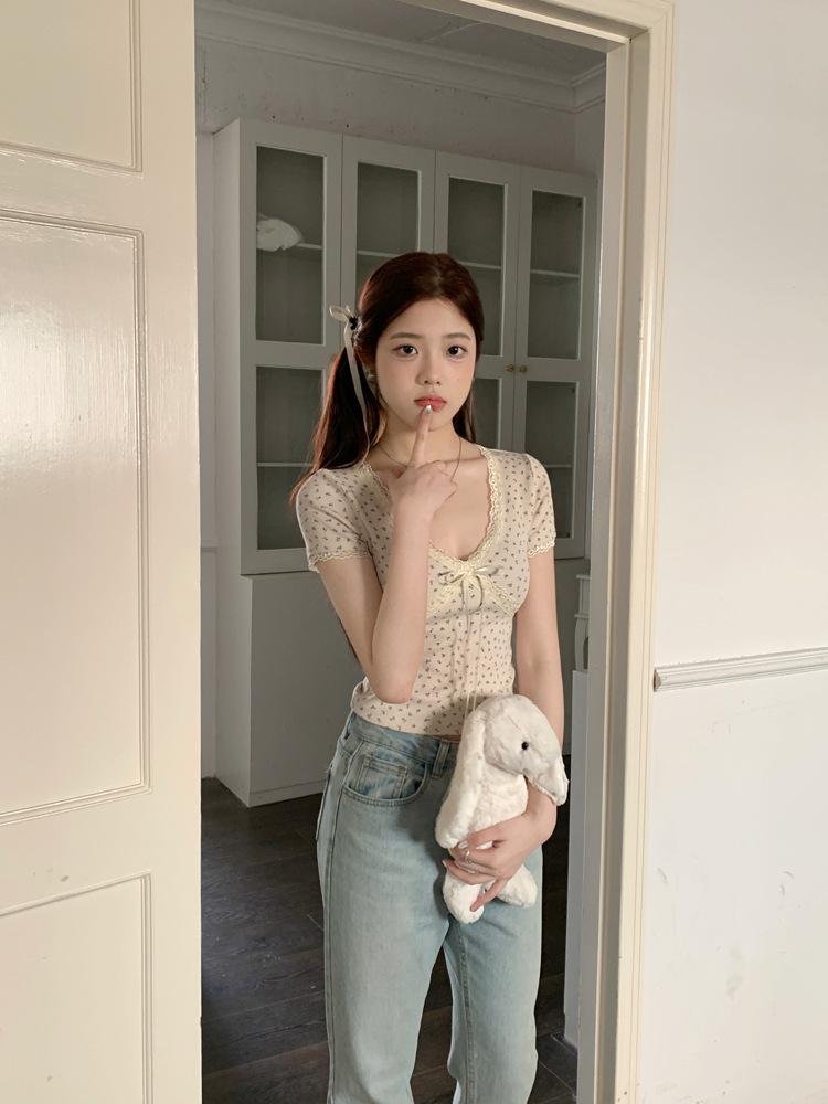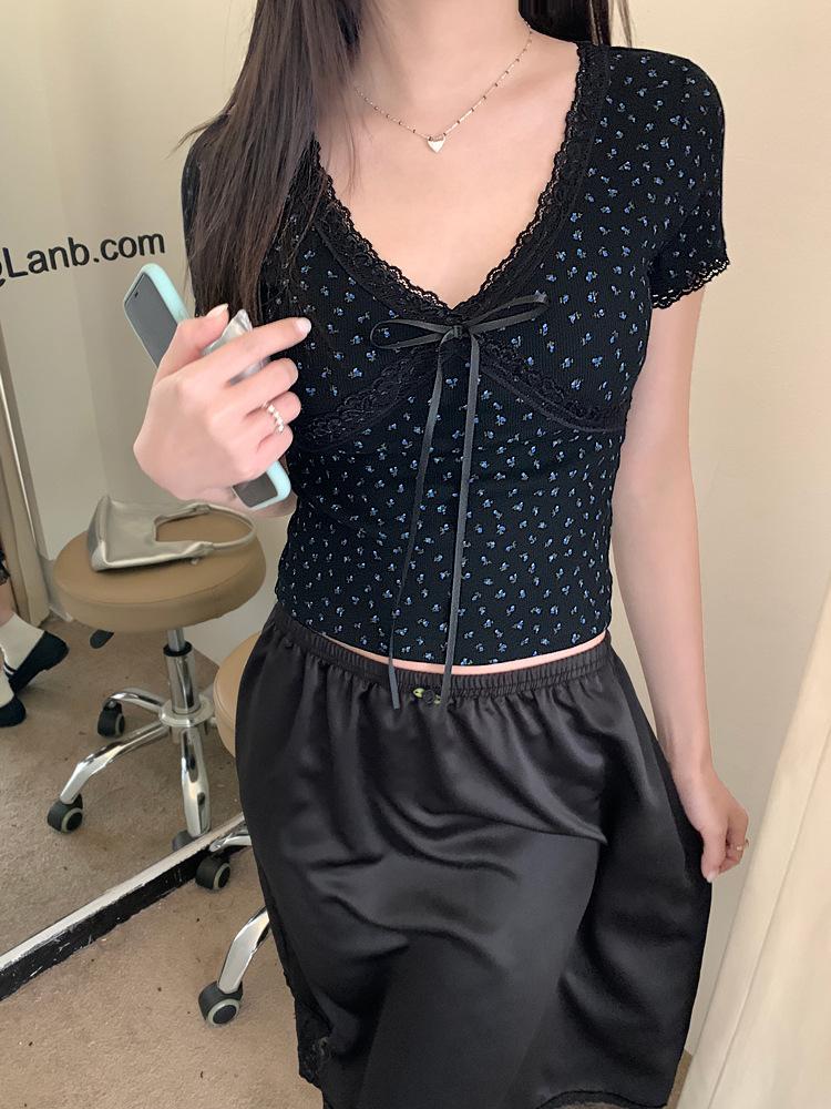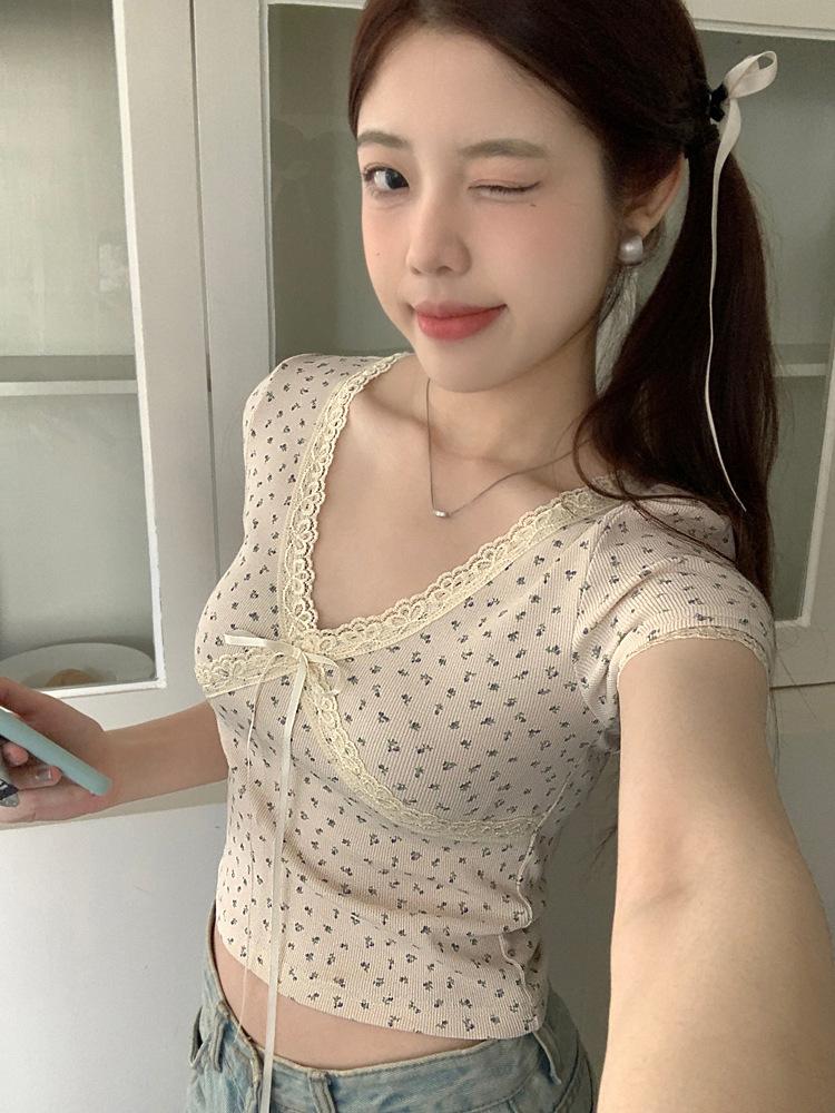 Verão Bow Top Slim-fit Short Base Shirt Design Nicho Renda Floral T-sleeve para Mulheres