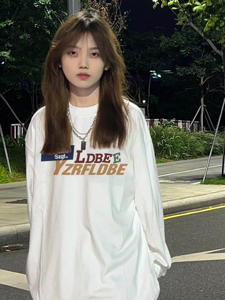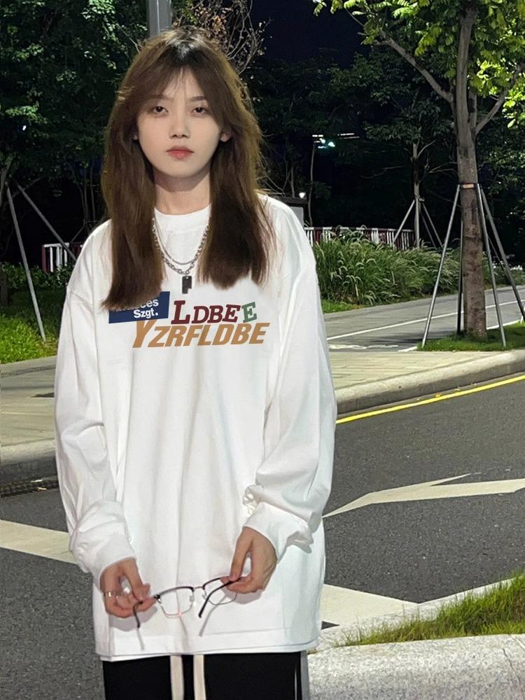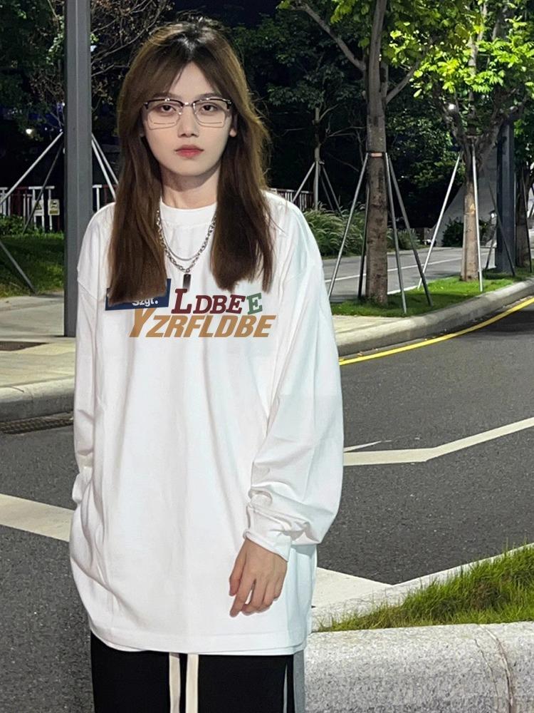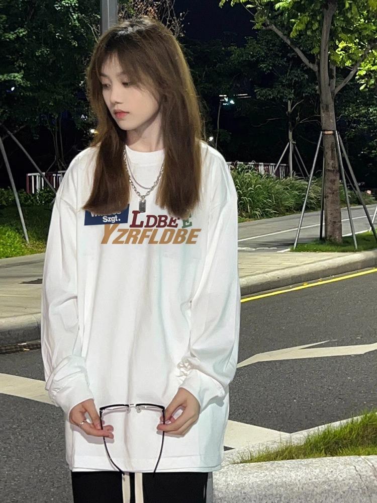 Pure Cotton marca de moda americana casual solto manga comprida T-shirt feminina primavera e outono nova letra preguiçosa estilo inferior camisa top