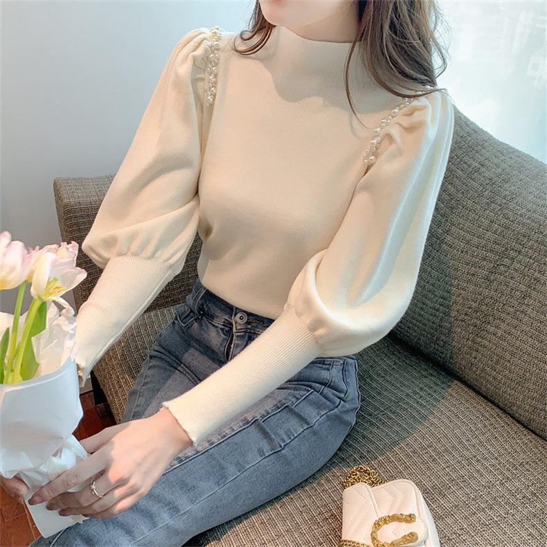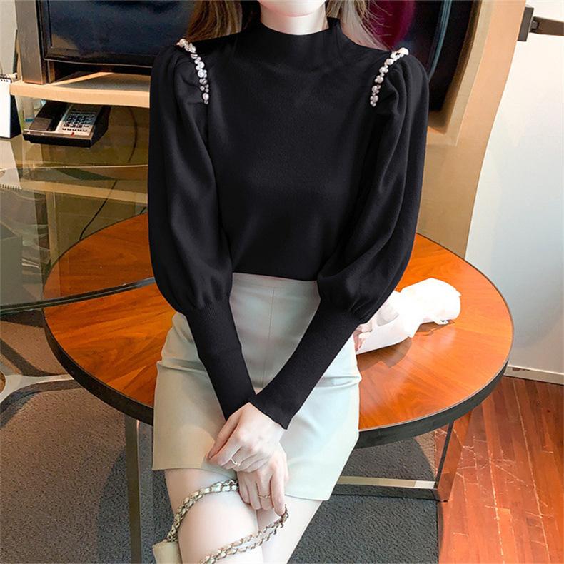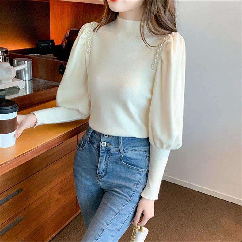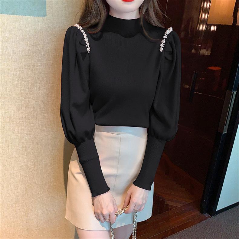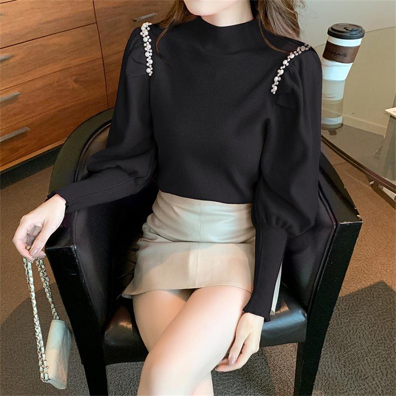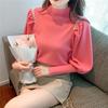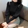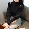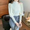 Meia gola tartaruga feminina frisada lanterna manga malha camisa inferior outono e inverno estilo ocidental suéter interior moda all-match slim top