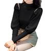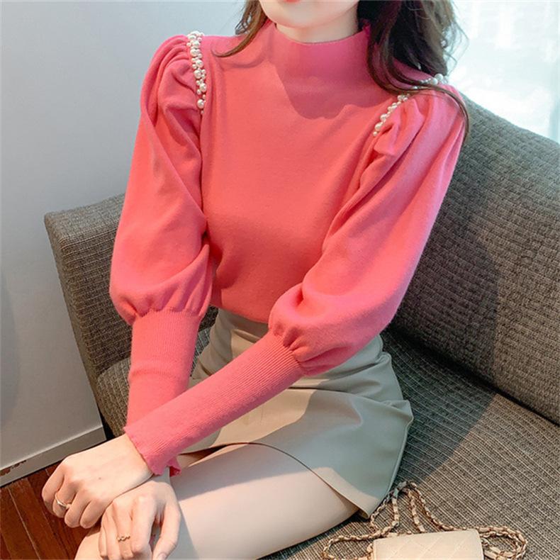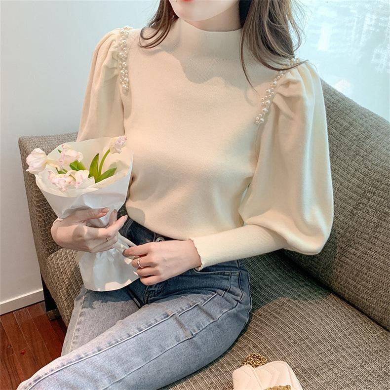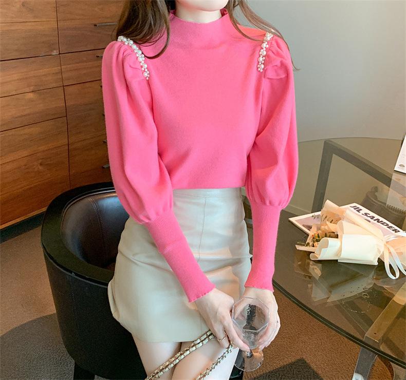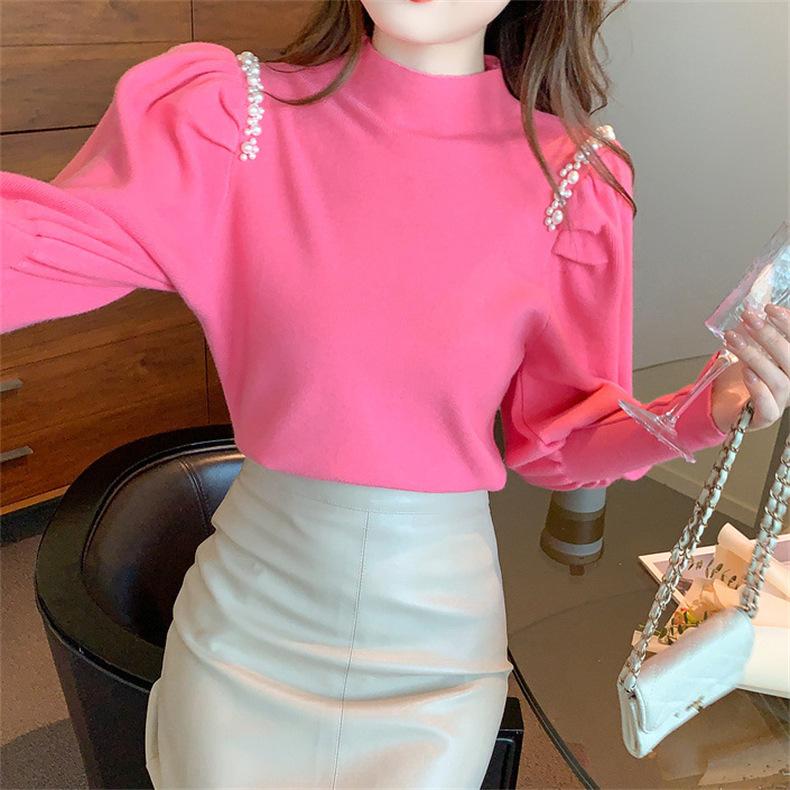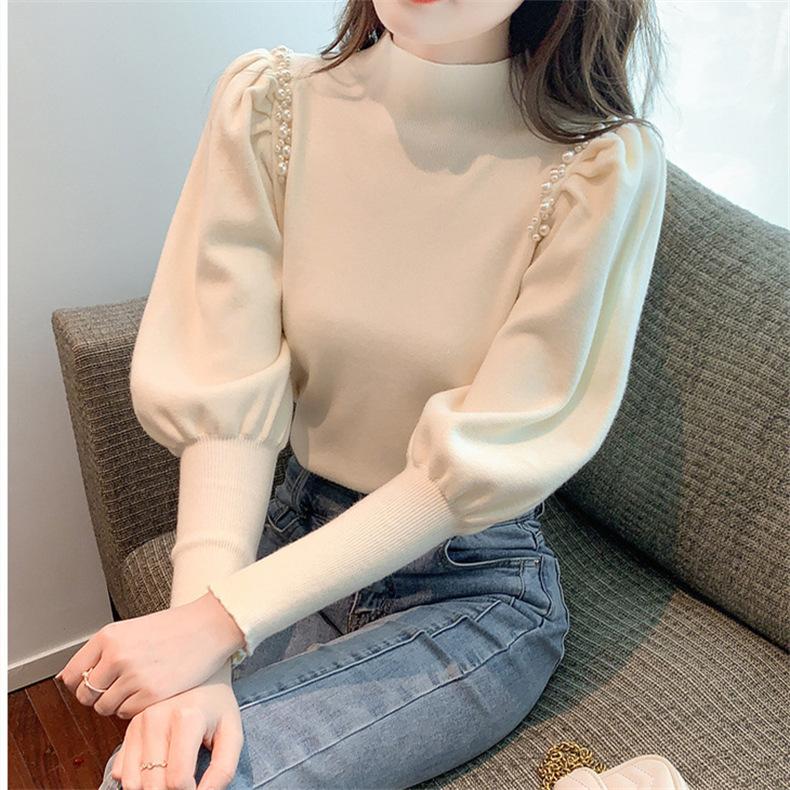 Meia gola tartaruga feminina frisada lanterna manga malha camisa inferior outono e inverno estilo ocidental suéter interior moda all-match slim top
