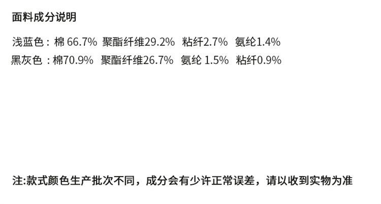 Black and gray trousers, Black and gray lengthened, Light blue trousers, Light blue lengthened