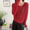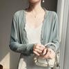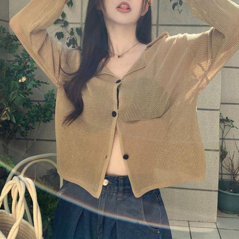 2023 Blusa Protetora Solar Curta Top V-Neck Oco de mangas compridas Malha Cardigan Loose Mulheres Design Thin Sense Nicho