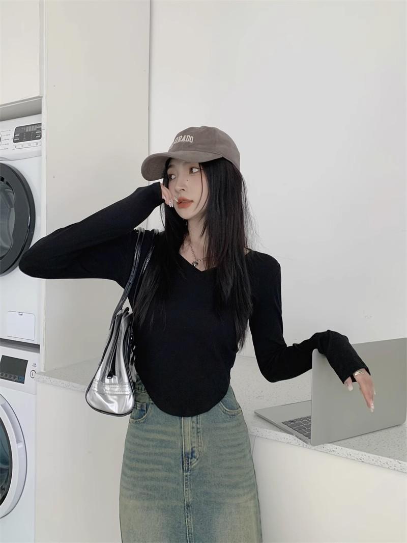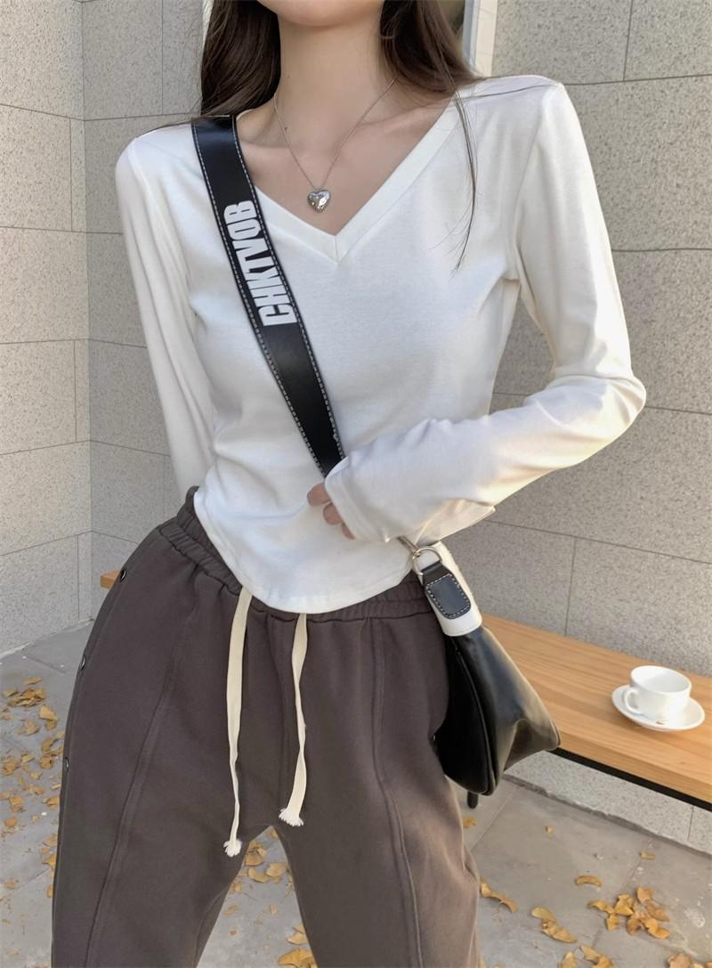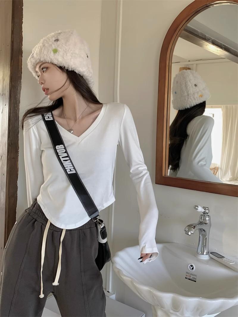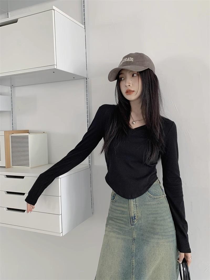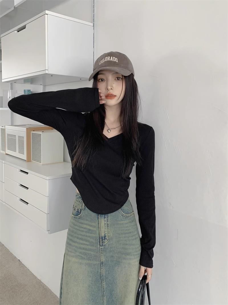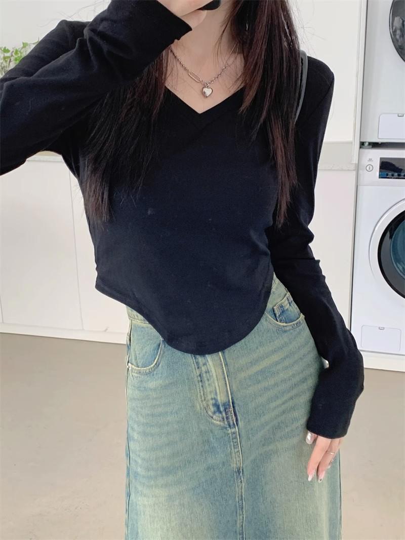 Camiseta de Manga Comprida com Decote em V para Mulheres no Outono e Inverno Novo Estilo Coreano Sexy Modeladora Look Bainha Assimétrica Curta Top para Usar por Baixo