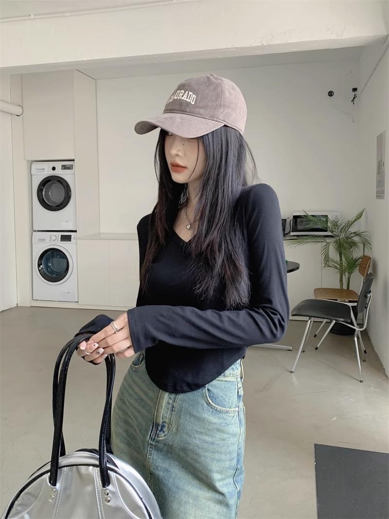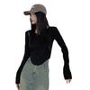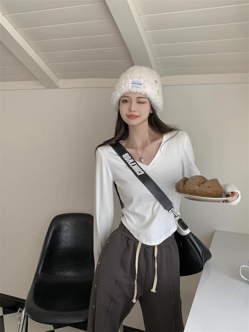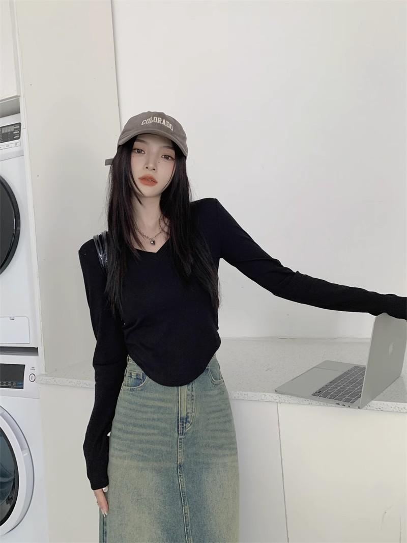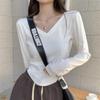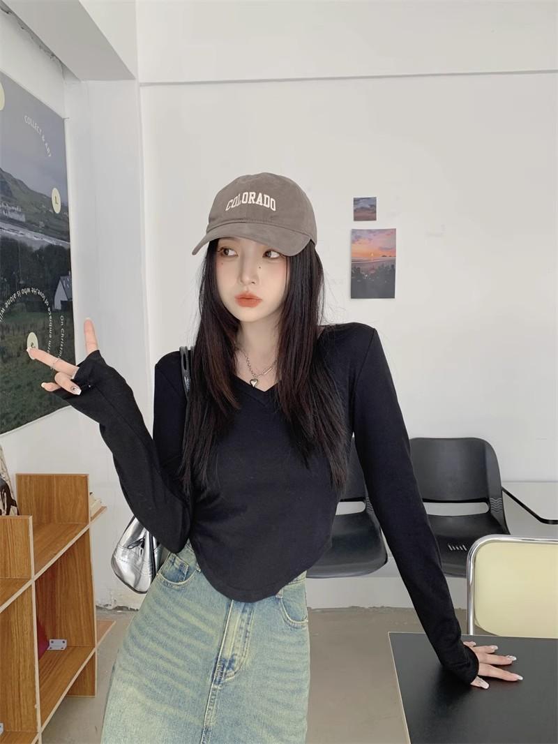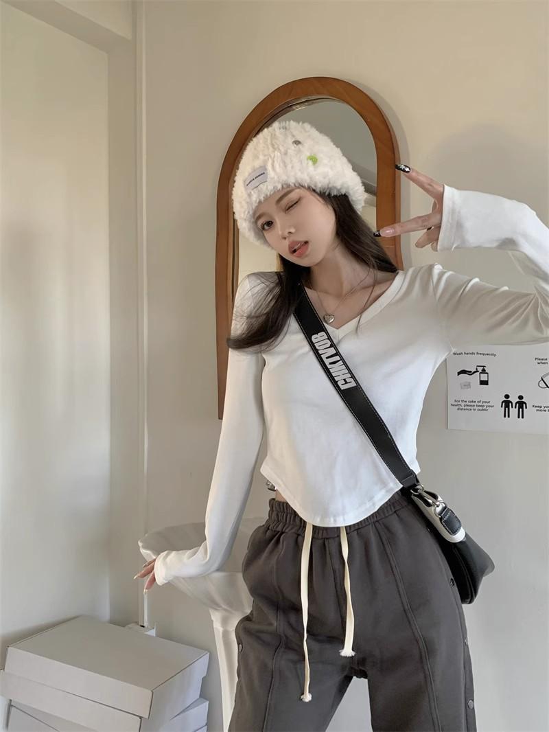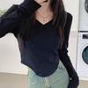 Camiseta de Manga Comprida com Decote em V para Mulheres no Outono e Inverno Novo Estilo Coreano Sexy Modeladora Look Bainha Assimétrica Curta Top para Usar por Baixo