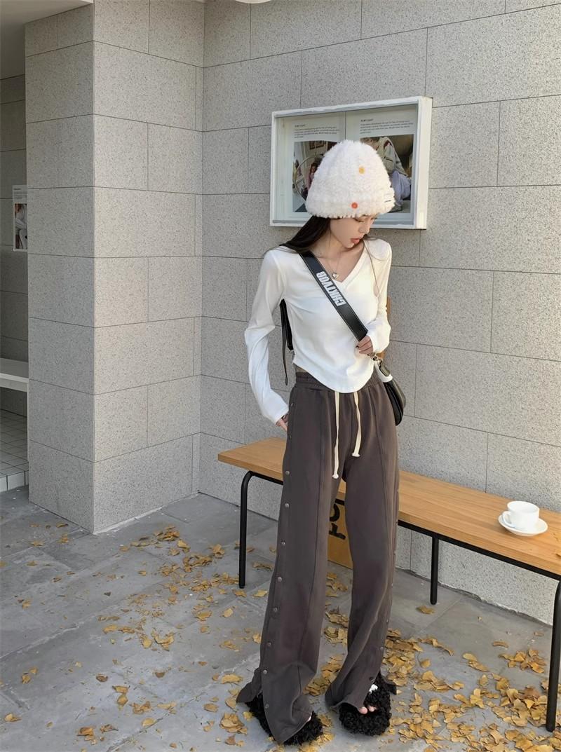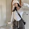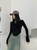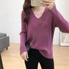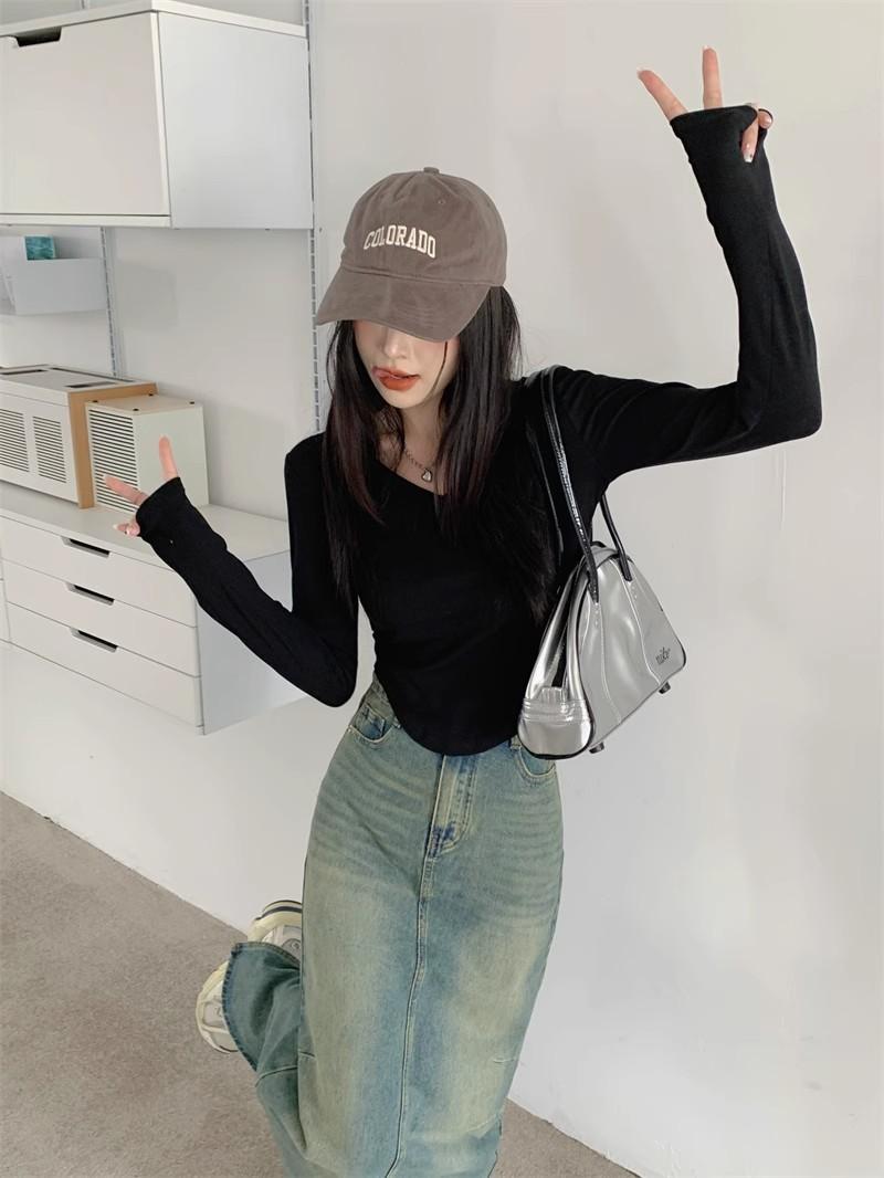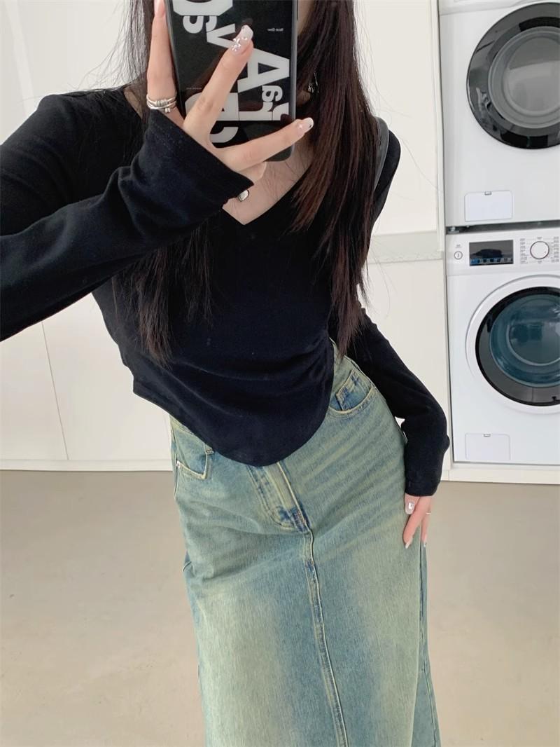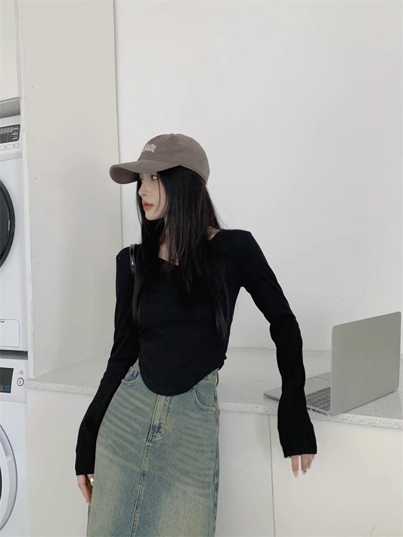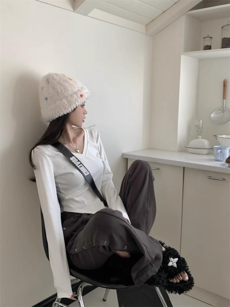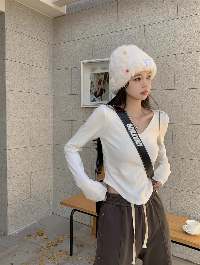 Camiseta de Manga Comprida com Decote em V para Mulheres no Outono e Inverno Novo Estilo Coreano Sexy Modeladora Look Bainha Assimétrica Curta Top para Usar por Baixo