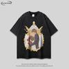 Marca de Moda de Rua Americana Animação Impressão de Desenhos Animados Lavagem Velha Água Camiseta de Manga Curta Camiseta Masculina e Feminina Pesada Retrô Meia Manga Preta